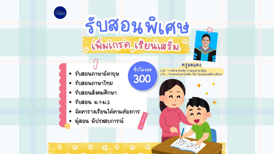 รับสอนพิเศษ อังกฤษ ไทย สังคม ม.1-ม.3 1. จัดตารางเรียนได้ตามต้องการ 2. ผู้สอน มีประสบการณ์