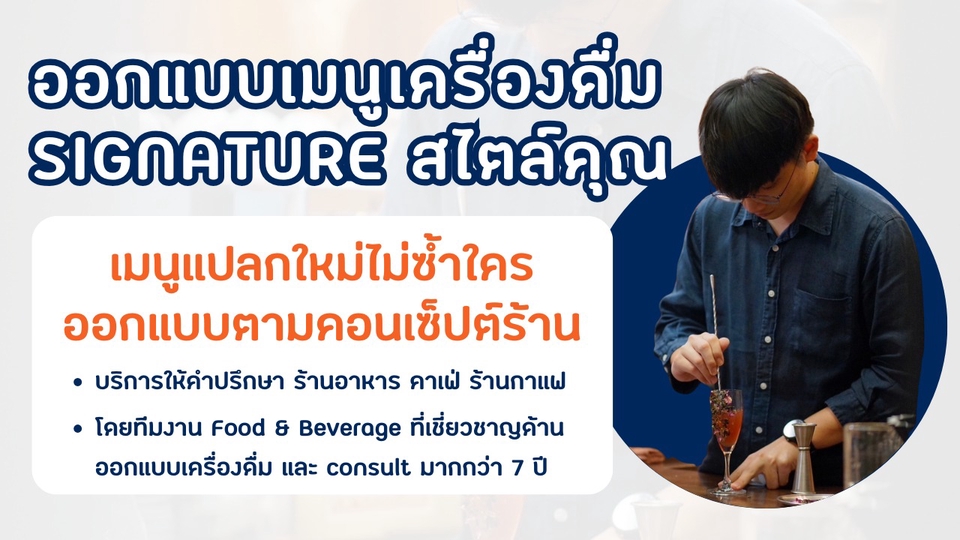 ออกแบบเมนูเครื่องดื่ม Signature สไตล์คุณ Beverage Signature Recipes (สูตรเมนูเครื่องดื่ม Signature สำหรับร้านอาหาร คาเฟ่ ร้านกาแฟ) คิดโดยมืออาชีพประสบการณ์มากกว่า 5 ปีในวงการร้านอาหารและคาเฟ่ การันตีด้วยผลงานการแข่งขันในไทยและสากล พัฒนาสูตร ส่วนผสม วัตถุดิบ ให้ได้ออกมาเฉพาะตัวไม่ซ้ำใคร เพื่อให้เป็นสินค้าเด่นของร้าน และสร้างยอดขายสูงสุดให้กับร้าน (USP)/เน้นใช้วัตถุดิบธรรมชาติ ลดการใช้วัตถุดิบปรุงแต่ง เพื่อให้ได้รสชาติและต้นทุนที่มีประสิทธิภาพ 📈 เพิ่มยอดขาย อยากให้คนมาลองกินเมนูที่เป็นไม่เหมือนใคร 🔑 หาจุดเด่นของร้าน เพื่อนำมาเปลี่ยนเป็นสตอรี่ของเครื่องดื่มนั้น ๆ 🔓 หาจุดยืนของแบรนด์เมื่อเทียบกับคู่แข่ง เพื่อสร้างเมนูที่แตกต่าง 📍 เจาะไปยังความต้องการของกลุ่มเป้าหมายของแต่ละร้าน เพื่อเป็นเมนูที่โดนใจ ขั้นตอนการทำงาน 1. พูดคุยรายละเอียด สอบถามไอเดียและความต้องการของลูกค้า 2. จัดทำแผนและแนวทาง 3. นำเสนอผลงาน และนัดชิมเมนูต้นแบบ 4. จัดทำรายการ สูตร และนัดวันอบรม 5. อบรมเสร็จสิ้นและส่งมอบงาน