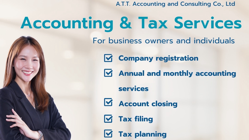 1. Account Closing Services 2. Annual Financial Statement Preparation 3. Monthly Tax Filing and Submission Services 4. Tax Planning and Personal Income Tax Filing 5. Visa Services and Visa Renewals 6. Company Registration and VAT Registration ขั้นตอนการทำงาน 1. Consulting 2. Planning 3. Submittion