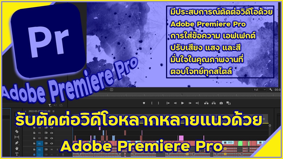 มีประสบการณ์การตัดต่อวิดีโอด้วย Adobe Premiere Pro สามารถตัดต่อวิดีโอได้หลากหลายแนว ไม่ว่าจะเป็นคอนเทนต์บน YouTube หรือโปรเจกต์อื่น ๆ มีทักษะในการใส่ข้อความ (Text), เอฟเฟกต์ (Effects), ปรับแต่งเสียง, แสง และสีให้เหมาะสมกับสไตล์ของวิดีโอ มั่นใจในคุณภาพงานตัดต่อที่สามารถตอบโจทย์ความต้องการของลูกค้าได้ ขั้นตอนการทำงาน 1. ตรวจสอบและคุยรายละเอียดของงาน 2. เริ่มทำงาน 3. ส่งงานให้ตรวจสอบ 4. แก้งาน 5. และขอคำแนะนำ