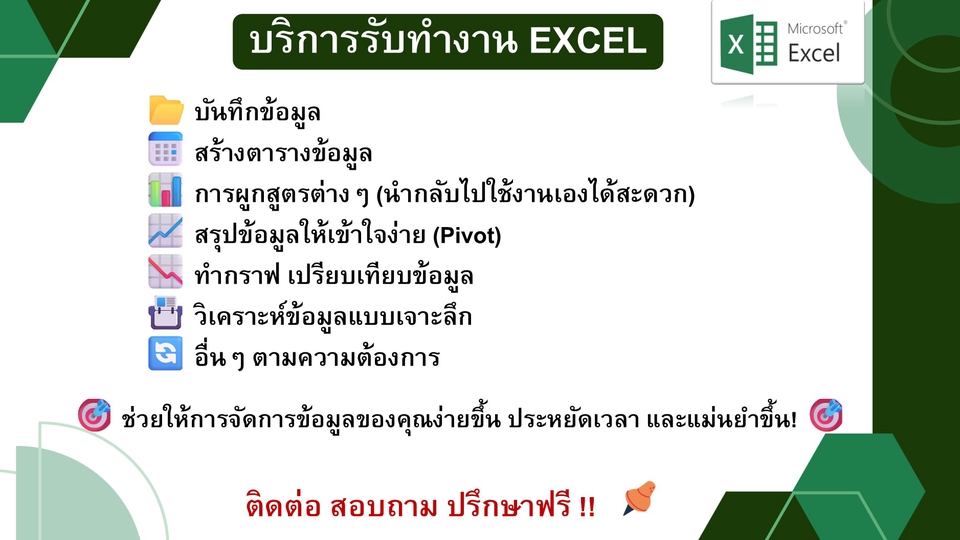 โปรแกรม Excel *สอบถามวิธีการใช้งานได้ตลอดชีพ* 1.บันทึกข้อมูล เช่น สต๊อกสินค้า ยอดขาย รายรับ รายจ่าย 2.คำนวณสต็อกคงเหลือ ยอดขาย รายรับ เงินเดือน 3.สรุปข้อมูลให้เข้าใจง่าย (Pivot) 4.การผูกสูตรต่างๆ สามารถให้ลูกค้านำกลับไปใช้งานเองได้สะดวก เช่น Sum Sumif Average Countif if ifs Vlookup 5.ทำ Template เพื่อให้ลูกค้า สามารถใช้งานซ้ำได้ โดยไม่ต้องแก้ไขใดๆ 6.ทำกราฟ ทำข้อมูลเปรียบเทียบ 7.ปรับแก้ได้ตามความต้องการ (ไม่กำหนดจำนวนครั้ง) 8.สอบถามวิธีการใช้งานได้ตลอดชีพ ทั้งนี้ขึ้นอยู่กับความต้องการของลูกค้า ขั้นตอนการทำงาน 1. พูดคุยเรื่องข้อมูลและความต้องการลูกค้า 2. สรุปความต้องการของลูกค้า 3. ส่งงานและแก้ไขตามความต้องการ 4. สรุปข้อมูลและสอนการใช้งาน