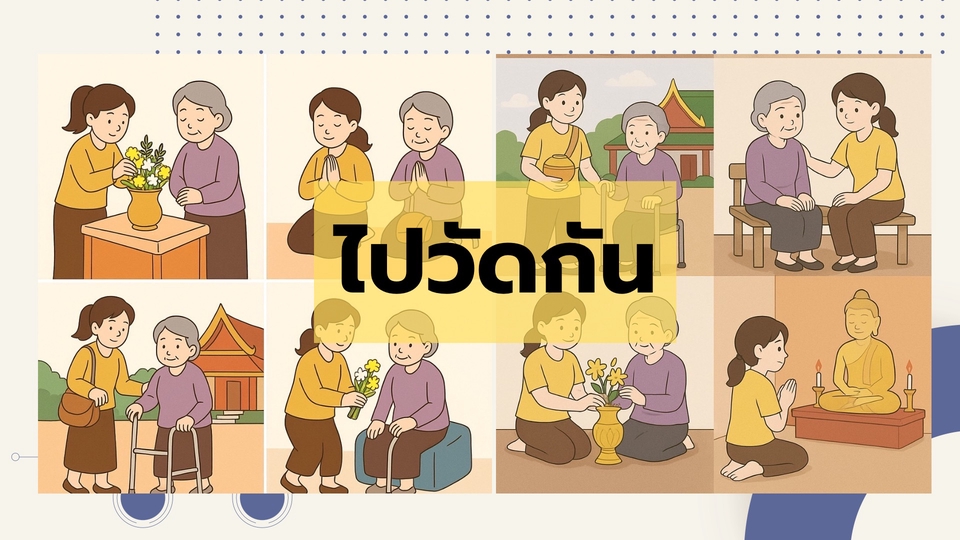 พาผู้สูงอายุไปวัด ไปทำบุญ พาไปไหวพระ ทำสังฆทาน ช่วยถือของดูแลดุจญาติมิตร ใจเย็น ชอบพูดคุยกับผู้ใหญ่ ชอบรับฟัง