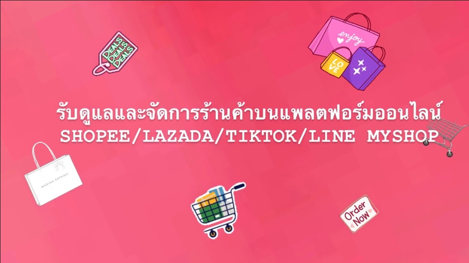 รับดูแลร้านค้าบนแพลตฟอร์มออนไลน์ Shopee Lazada Line Tiktok ตั้งแต่ลงสินค้า setting promotion เพื่อส่งเสริมการขาย เข้าร่วมแคมเปญต่างๆแพลตฟอร์ม รีพอร์ตยอดขายรายวัน รายอาทิตย์ และรายเดือน ขั้นตอนการทำงาน 1. รับบรีฟหรือข้อมูลอื่นๆ เช่นข้อมูลสินค้ารูปแพคช้อต 2. ลงสินค้าและส่งข้อมูลสอนค้าที่ลงเรียบร้อยให้ร้านค้าตรวจสอบ 3. สำหรับpackage 2ขึ้นไป จะมีการทำ proposal แคมเปญเพื่อนำเสนอ promotion สำหรับแคมเปญ 4. Setting backend โปรโมชั่น 5. สำหรับpackage 3จะมีการทำรีพอร์ตยอดขาย รายวัน รายอาทิตย์และรายเดือนให้ รวมไปถึงการแนะนำโปรแกรมหรือแคมเปญที่ร้านค้าควรเข้าร่วมเพื่อดันยอดขาย
