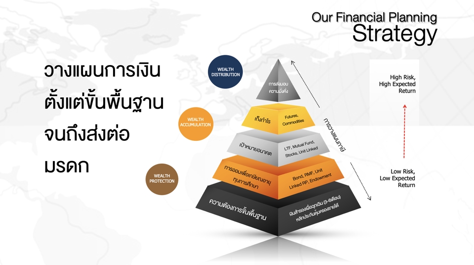 ฿1,000แผนการเงินที่ครอบคลุมทั้งเรื่อง การจัดการหนี้สิน การออม การลงทุน การป้องกันความเสี่ยง การจัดการภาษี วางแผนเกษียณ และวางแผนมรดก รวมไปถึงเป้าหมายอื่นๆ เช่น ซื้อบ้าน ซื้อรถ แต่งงาน และ แผนการศึกษาบุตร