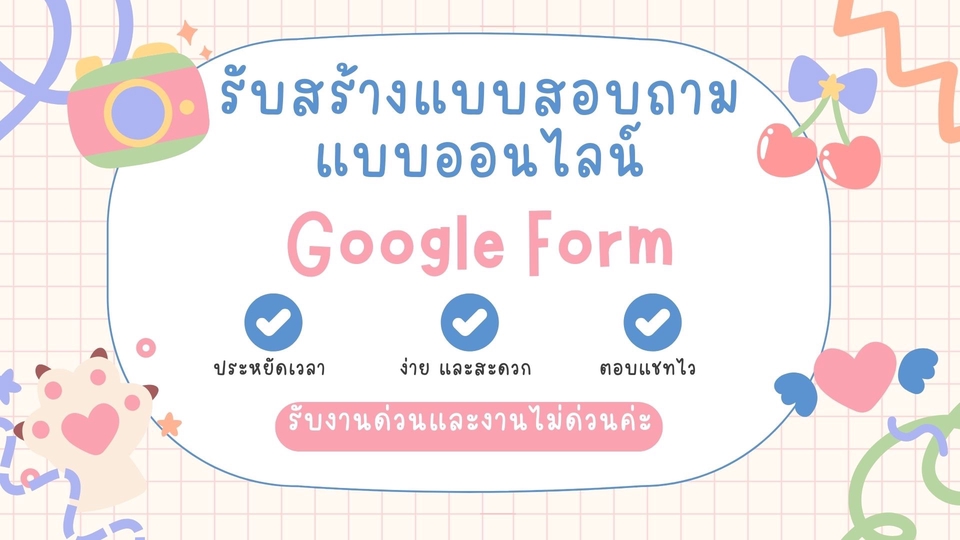 รับสร้างแบบสอบถาม ออนไลน์ Google Forms รูปแบบของ Link หรือ QR Code - ลูกค้าส่งรายละเอียดงานพร้อมส่งลิงค์แบบฟอร์มให้พิจารณาราคา - ลูกค้าสามารถเลือก ธีม ภาพพื้นหลัง สี หรือภาพประกอบต่าง ๆ ตามที่ต้องการได้ - แก้ไขได้หากมีข้อผิดพลาด ( 1 ครั้ง ) - 1 - 26 ข้อ เริ่มต้นที่ 400 บาท (เกิน 26 ข้อ + 2 บาท) ขั้นตอนการทำงาน รับสร้างแบบสอบถาม ออนไลน์ Google Forms 1. คุยรายละเอียดของงาน จุดประสงค์ของงาน 2. ลูกค้าส่งเนื้อหาแบบสอบถาม เพื่อประเมินราคา 3. ฟรีแลนซ์แจ้งราคาแก่ลูกค้า 4. หากลูกค้าตกลงจ้างงาน ฟรีแลนซ์ส่งใบเสนอราคาให้แก่ลูกค้า 5. ลูกค้าโอนเงินผ่านระบบ 6. ฟรีแลนซ์ส่งงานให้ลูกค้าเมื่องานเสร็จงานทันที เพื่อให้ลูกค้าอนุมัติงานและรีวิวงานให้ ขั้นตอนการทำงาน 1. คุยรายละเอียดกับลูกค้า และพร้อมขอรายละเอียดของงาน 2. เริ่มทำงานตามระบบ (ทำใบเสนอราคา) 3. จบการทำงาน