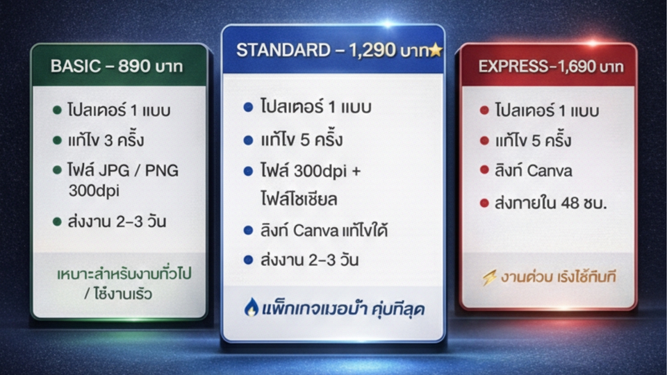฿890•โปสเตอร์ 1 แบบ • แก้ไข 3 ครั้ง • ไฟล์ JPG / PNG 300dpi • ส่งงาน 2–3 วัน (ไม่รวมลิงก์แก้ไข Canva)