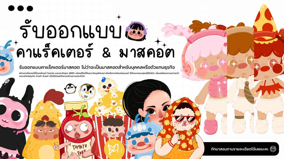 ▶ ออกแบบคาแรคเตอร์ Character โลโก้ มาสคอต สำหรับบุคคลทั่วไป หรือใช้ประกอบธุรกิจ 🟠 แพ็กเกจ 1 - วาดแฟนอาร์ เช่น ของขวัญ อื่นๆ (ไม่อยู่ในเชิงธุรกิจ) 🔵แพ็กเกจ 2 - โลโก้สำหรับ แบรนด์สำหรับธุรกิจ 🟡 แพ็กเกจ 3 - มาสคอต ● รายละเอียดราคาเพิ่มเติม • ออกแบบคาแรคเตอร์ เกียวกับแบรนด์ หรือ สินค้าต่างๆ • คาแรคเตอร์คน และ สัวต์เลี้ยง ● กรณีลูกค้าที่ต้องการนำ ไฟล์ เพื่อไปต่อยอดในงาน หรือนำไปใช้ในทำสิ่งพิมพ์ , ส่งให้โรงพิมพ์ เพิ่ม + 700 บาท ● ออกแบบคาแรคเตอร์ หรือ เปลี่ยนคนให้เป็นการ์ตูน 1 แบบ 1 ท่าทาง +100 บาท เพิ่มสัตว์เลี้ยง หรือ สิ่งของขนาดใหญ่ +300 บาท หาต้องการคาแรคเตอร์คู่ หรือ รูปคู่ ──────────────────────────────────────────────────────────── ✿ ราคาแพ็กเกจเป็นเพียงราคาที่ประเมินไว้เท่านั้น ราคาจะขึ้นอยู่กับรายละเอียดของงานนั้นๆ ✿ ● คาแรคเตอร์เป็นการวาดมือ และ ออกแบบใหม่ทั้งหมด อาจจะทำให้การทำงานล่าช้าอยู่บ้าง หากลูกค้าต้องงานเร่ง ให้พูดคุยตกลงก่อนจ้างงาน ขั้นตอนการทำงาน 1. การประชุมเบื้องต้น (Briefing) พูดคุยเกี่ยวกับรายละเอียดที่คุณต้องการ: เช่น ธีม บุคลิก ลักษณะเฉพาะ จุดประสงค์ในการใช้งาน และสไตล์ของมาสคอต ระบุกลุ่มเป้าหมายที่มาสคอตจะต้องสื่อสารด้วย เช่น สำหรับเด็กวัยรุ่น ผู้ใหญ่ หรือกลุ่มคนที่สนใจการ์ตูน ระบุอุปกรณ์หรือสิ่งของเสริม เช่น รถ สัตว์เลี้ยง หรืออุปกรณ์เฉพาะอื่น ๆ 2. การค้นหาแรงบันดาลใจและการสเก็ตช์เบื้องต้น (Concept & Sketching) นักออกแบบจะค้นคว้าข้อมูลเพิ่มเติมเกี่ยวกับสไตล์และลักษณะของมาสคอตที่ตรงตามความต้องการ เริ่มการสเก็ตช์เบื้องต้น โดยออกแบบรูปร่างหน้าตา ท่าทาง และบุคลิกของมาสคอต รวมถึงการเพิ่มสิ่งของประกอบตามที่กำหนด ส่งสเก็ตช์เบื้องต้นให้คุณตรวจสอบ เพื่อให้ได้ความคิดเห็นและปรับแก้ไขเบื้องต้น 3. การพัฒนาแนวคิดและรายละเอียด (Concept Refinement) นำความคิดเห็นจากการสเก็ตช์เบื้องต้นมาปรับปรุงและพัฒนา ให้มาสคอตมีรายละเอียดที่ครบถ้วน เช่น การปรับเสื้อผ้า สีหน้า หรือท่าทางต่าง ๆ หากมีการเพิ่มอุปกรณ์หรือของประกอบ จะออกแบบให้สอดคล้องกับตัวคาแรคเตอร์อย่างลงตัว ส่งตัวอย่างที่ปรับปรุงแล้วให้คุณตรวจสอบอีกครั้งเพื่อความพึงพอใจ 4. การลงสีและทำรายละเอียดขั้นสุดท้าย (Final Design) เริ่มการลงสีและปรับรายละเอียด เช่น เงา การจัดองค์ประกอบ และการไล่สีเพื่อให้มาสคอตดูมีชีวิตชีวา ทำการปรับแก้ไขขั้นสุดท้ายตามความคิดเห็นที่ได้รับจากคุณ และตรวจสอบความลงตัวของมาสคอตในภาพรวม 5. การส่งมอบผลงาน (Delivery) จัดทำไฟล์มาสคอตในรูปแบบต่าง ๆ ที่สามารถใช้งานไ