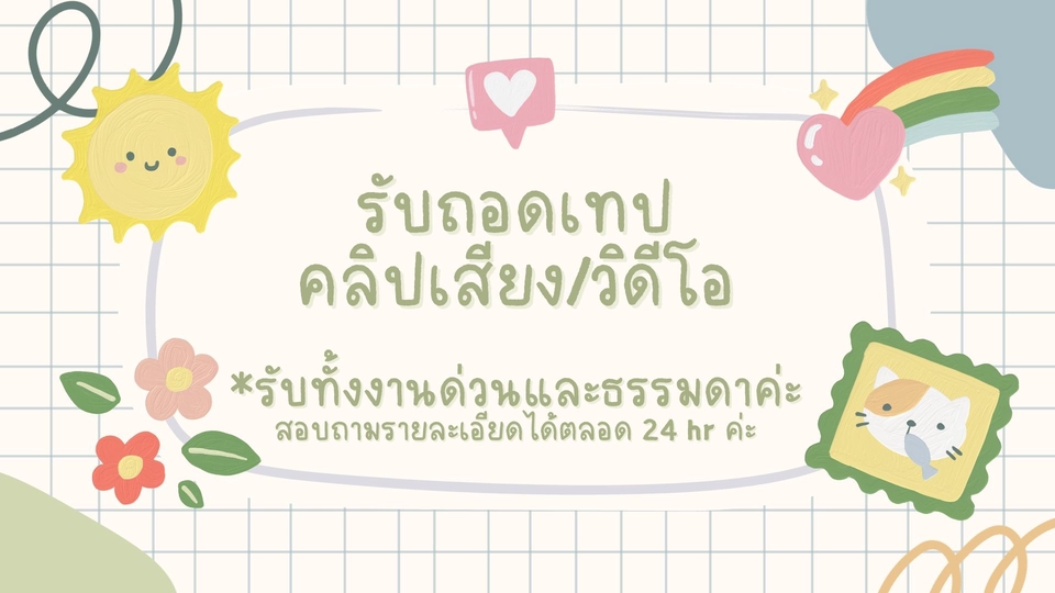 เขียนบทความจากการถอดเทปหรือวิดีโอ / คลิปเสียง ราคาขึ้นอยู่กับความสั้นและยาวของเนื้อหาค่ะ สามารถแก้ไขงาน ฟรี 3 ครั้ง -ต้องเป็นงานเดิม ไม่ใช่งานที่เป็นเนื้อหาใหม่* ลูกค้าจะได้รับไฟล์ PDF ในการดูงาน และส่งมอบงานเป็นลิ้งค์ Google drive หรือตามที่ลูกค้าต้องการค่ะ คุณลูกค้าสามารถทักแชท สอบถามและพูดคุยรายละเอียด ตกลงราคากันได้ค่ะ ขั้นตอนการทำงาน 1. คุณลูกค้าติดต่อสอบถามรายละเอียดงานและตกลงค่าใช้จ่าย 2. คุณลูกค้าทำการโอนค่าใช้จ่ายให้ร้าน 3. ทางร้านรับยอด และเริ่มดำเนินงาน 4. เมื่อเสร็จงานจะส่งผลงานให้ตรวจเช็คดูก่อน 5. ลูกค้าคอนเฟิร์มรับงาน และทางเราจะจัดส่งไฟล์ให้ทันที 6. จบงาน