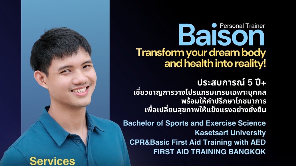 🔥ทดลองเทรนฟรี/ปรึกษาฟรี🔥 สวัสดีครับ 🙏🏻 ผมเทรนเนอร์ ใบสน มีประสบการณ์การสอนออกกำลังกายมากกว่า 5 ปี จบวิทยาศาสตร์การกีฬา ม.เกษตรศาสตร์ (เกียรตินิยมอันดับสอง) 🎓 ✳️รับสอนออกกำลังกายส่วนตัว✳️ 1:1| 1:2/ ผู้สูงอายุ สถานที่ 📍 ฟิตเนสคอนโด/ฟิตเนสหมู่บ้าน,ฟิตเนสที่ให้เทรนเนอร์ฟรีแลนซ์เข้าไปเทรนได้ พื้นที่ : รัชดา/ห้วยขวาง/สุทธิสาร/ลาดพร้าว/จตุจักร/สะพานควาย/รัชโยธิน หรือ พื้นที่ตามตกลง ⭐️Service(การบริการ) ⭐️ - พื้นฐานการออกกำลังกายเบื้องต้น - สร้างกล้ามเนื้อ และพัฒนาความแข็งแรง ด้วยเวทเทรนนิ่ง ในรูปแบบต่างๆ เช่น circuit training, functional training - ลดไขมันแบบยั่งยืนไม่กลับมาโยโย่ด้วยการเข้าใจกลไกของร่างกาย - แนะนำโภชนาการเบื้องต้นให้สอดคล้องกับเป้าหมายและไลฟ์สไตล์ - ช่วยกระตุ้น สร้างแรงบันดาลใจ ให้มีวินัยในการออกกำลังกายและดูแลสุขภาพได้ด้วยตนเอง - การออกกำลังกายสำหรับผู้สูงวัย เพื่อให้มีคุณภาพชีวิตที่ดีขึ้น ป้องกันการเสื่อม พึ่งพาตนเองได้ ❇️สิ่งที่คุณลูกค้าจะได้เมื่อเริ่มเทรน❇️ - การประเมินและทดสอบสมรรถภาพร่างกายก่อนเทรน - การวัดผลหลังจากการเทรนที่สอดคล้องกับเป้าหมายของลูกค้า - พูดคุยให้คำแนะนำผ่านไลน์ส่วนตัวและสามารถสอบถามเรื่องที่เกี่ยวข้องกับสุขภาพและออกกำลังกายเพิ่มเติมนอกเหนือจากชั่วโมงการเทรนส่วนตัว ขอบคุณครับ