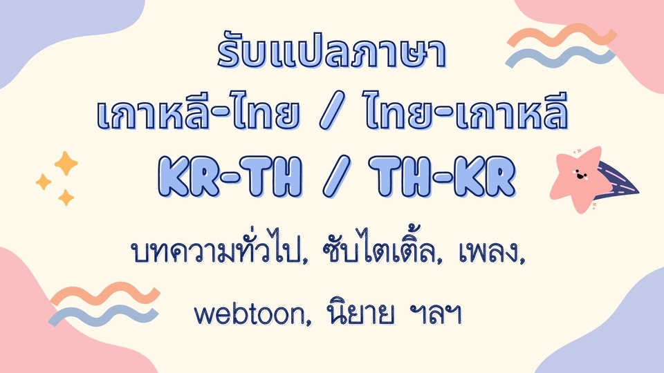 สวัสดีค่ะ รับแปลภาษาเกาหลี - ไทย และ ไทย - เกาหลี จบการศึกษาจากคณะอักษรศาสตร์ วิชาเอกภาษาเกาหลี มีผลการสอบวัดระดับภาษาเกาหลี (TOPIK) ระดับ 5 มีประสบการณ์แปลเพลง, Webtoon และ Short Drama ค่ะ