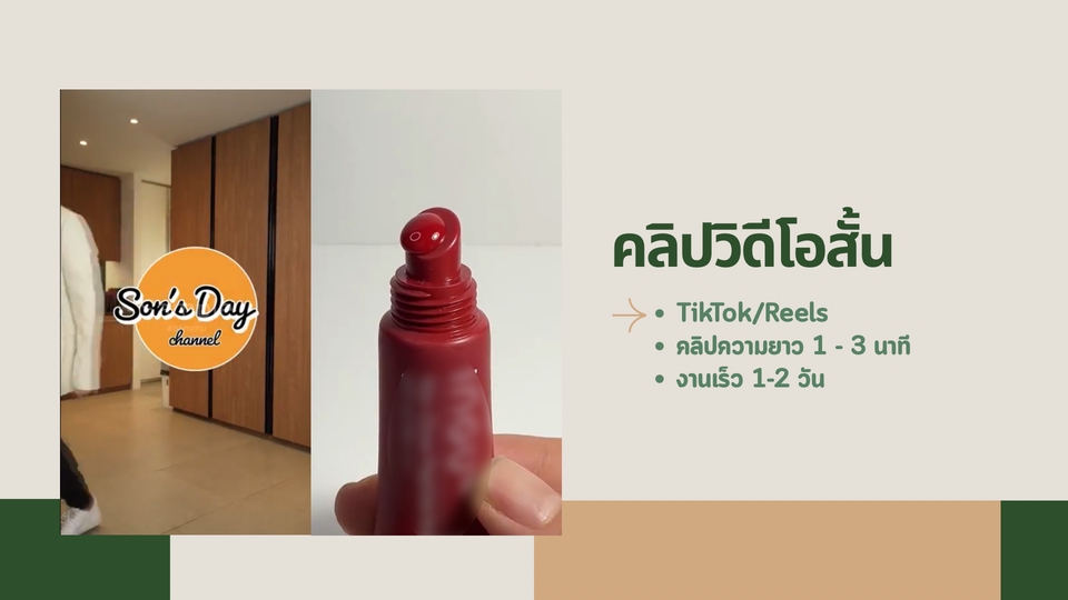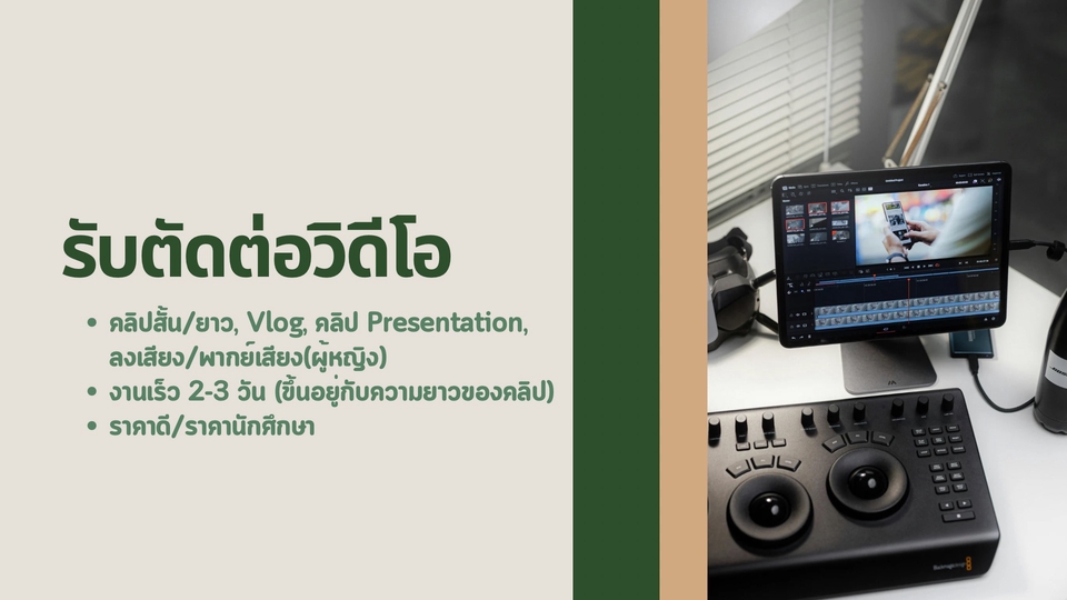 รับตัดต่อ Video สั้น เช่น Vlog, คลิปพรีเซนต์งาน, วิดีโอ Dance cover, ใส่ซับ(ภาษาไทย/ภาษาอังกฤษ), พากย์เสียง/ลงเสียง(ผุ้หญิง), Tiktok, Reels เป็นต้น **สนใจสามารถติดต่อสอบถามก่อนได้เลยค่ะ** ตัวอย่างงาน https://drive.google.com/drive/folders/1DsRFveBNyZnFgKk1xIVtlZ3YCuNu-YjB ขั้นตอนการทำงาน 1. แจ้งรายละเอียด บรีฟงาน และความต้องการของงานทั้งหมด 2. อัปโหลดวิดีโอสำหรับการตัดต่อ และส่งรายละเอียดที่จะใส่ในคลิป (เช่น สคริปต์, เสียง/sound) ลงใน Google drive และส่งสิงก์ให้กับฟรีแลนซ์ 3. ฟรีแลนซ์ส่งใบเสนอราคา 4. ส่งงานให้ลูกค้าตรวจสอบความถูกต้องของงาน (draft) และให้ลูกค้ากดอนุมัติงาน 5. เมื่อลูกค้ากดอนุมัติงาน และฟรีแลนซ์แก้งานเสร็จแล้ว จะส่งงานที่สมบูรณ์ให้ลูกค้า(Google drive)