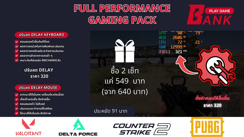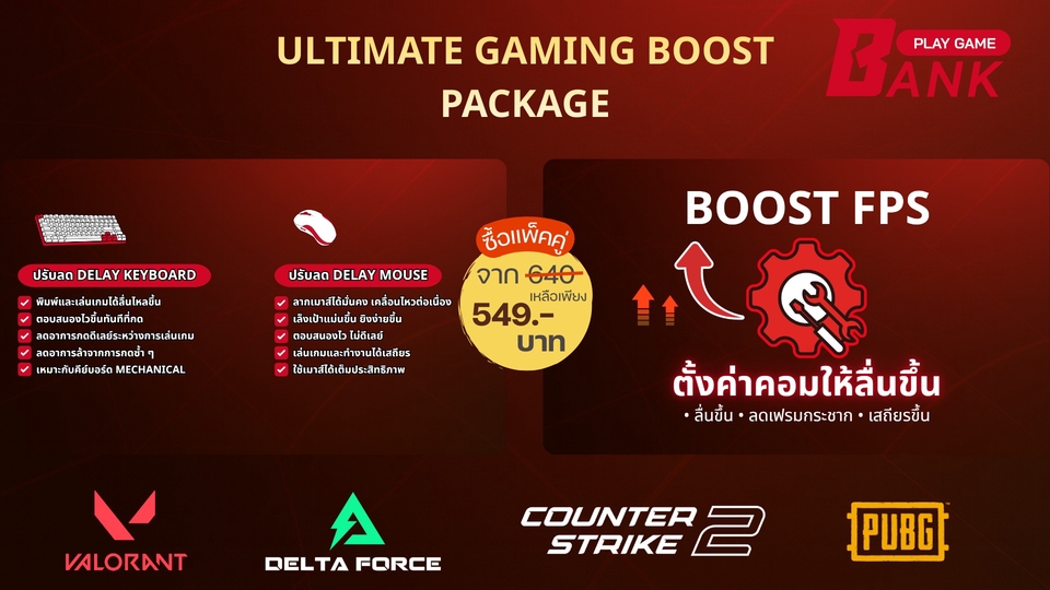 บริการปรับตั้งค่าคอมและอุปกรณ์ให้มีประสิทธิภาพ ด้วยประสบการณ์จริงที่การันตีจากทีม PUBG Esport ชั้นนำ เช่น Full Sense, Buriram, eArena, FW Esport, T5 Esport เราพร้อมมอบการตั้งค่าที่เหมาะสม ช่วยเพิ่มความเสถียร ลดดีเลย์ และดึงศักยภาพของเครื่องออกมาให้เต็มที่ได้มากที่สุด