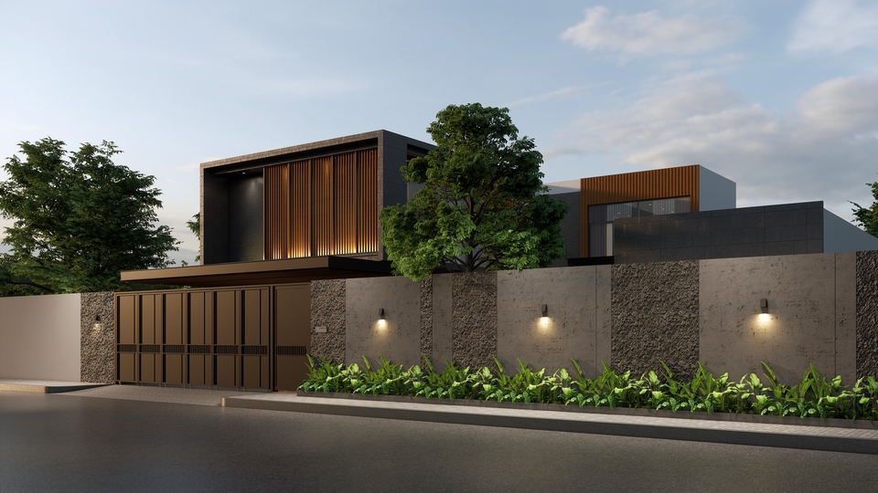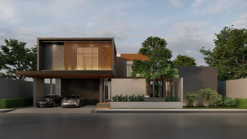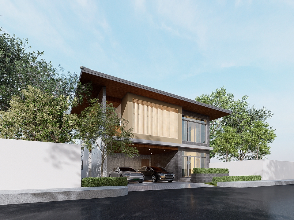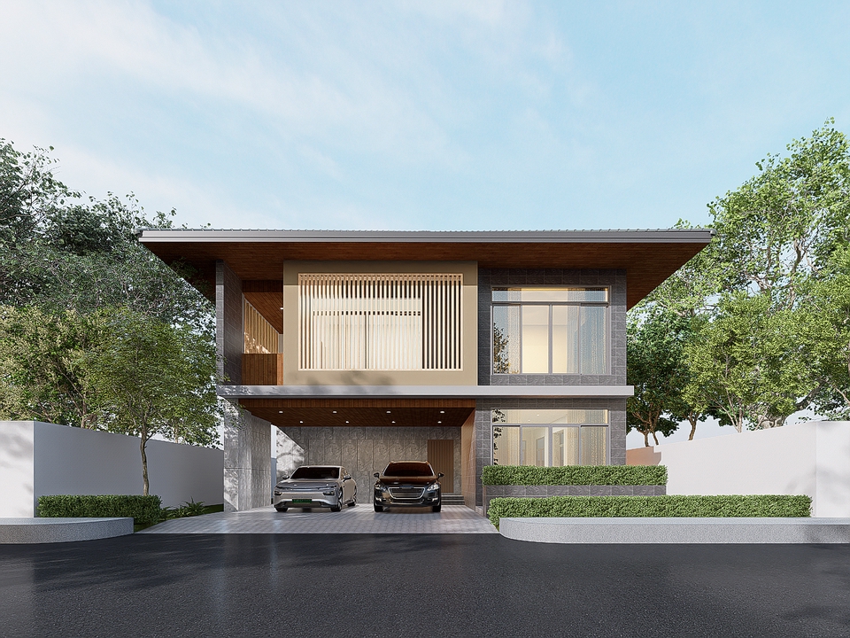 บ้านเดี่ยว 2 ชั้น สไตล์ Modern tropical พื้นที่ใช้สอย 1 ห้องรับแขก 1 ห้องรับประทานอาหาร 1 ห้องครัว 4 ห้องนอน 4 ห้องน้ำ วัสดุที่ใช้ เน้นไม้สำเร็จรูป และกรุกระเบื้องโทนสีเทาเข้ม ขั้นตอนการทำงาน 1. นัดพูดคุย เพื่อทราบความต้องการ พื้นที่ใช้สอย สถานที่ตั้งโครงการ ประมาณราคางานออกแบบเบื้องต้นและรายละเอียดอื่นๆ 2. นัดวันและเวลา เพื่อสำรวจหน้างานก่อสร้าง 3. วิเคราะห์และเสนอแนวความคิดเบื้องต้นกับทางลูกค้าในส่วนของตำแหน่งการวางแปลนและรูปแบบอาคาร 4. ชำระค่ามัดจำก่อนเริ่มงาน 15% ของราคาประมาณราคางานออกแบบเบื้องต้น 5. ทำ วิเคราะห์ที่ตั้งโครงการ / mood and tone / reference / Lay out วางผัง และเฟอร์นิเจอร์ / mass model ส่งให้ผู้ว่าจ้าง ถือเป็นการเสนอแบบครั้งที 1 6. เมื่อผู้ว่าจ้างเลือกแบบ และปรับแก้ไขแบบแปลนและภาพ 3 มิติ 1-3 ครั้ง จะส่งงานและนำเสนอแบบ Final กับทางผู้ว่าจ้างและเริ่มขั้นตอนต่อไป 7. เริ่มขั้นตอนการเขียนแบบเพื่อขออนุญาตก่อสร้างและเซ็นรับรองแบบจากสถาปนิกและวิศวกร