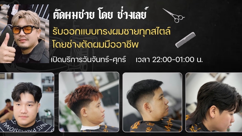 อัปเดตลุคใหม่กับบริการตัดผมชายที่มีให้เลือกทั้งสไตล์แฟชั่นทันสมัยและวินเทจสุดคลาสสิก ใส่ใจทุกรายละเอียดตั้งแต่การเลือกทรงที่เหมาะกับโครงหน้า ไปจนถึงการเก็บรายละเอียดงานผมที่เนี๊ยบที่สุด จุดเด่น: - ออกแบบทรงผมให้เข้ากับบุคลิก - งานตัดละเอียด คมชัดทุกองศา - รับตัดทั้งแนวเท่ ดิบ หรือเนี้ยบแบบสุภาพ สนใจปรับลุคใหม่ ทักมาสอบถามคิวหรือปรึกษาทรงที่ชอบก่อนได้