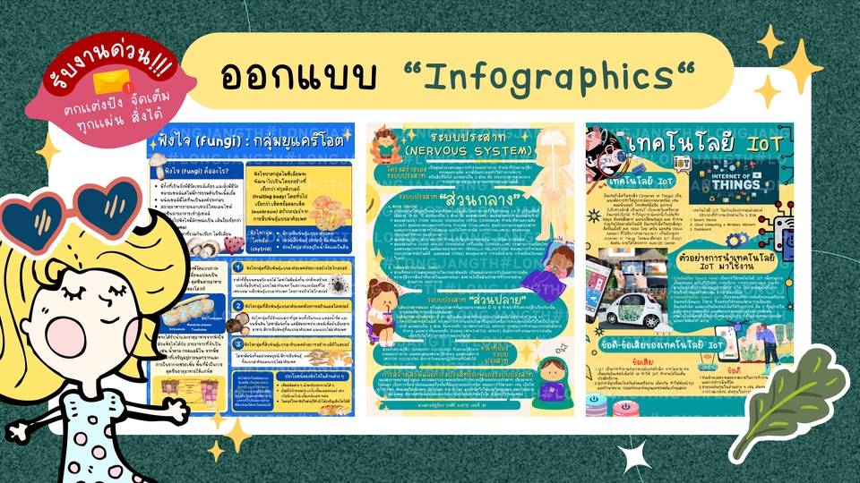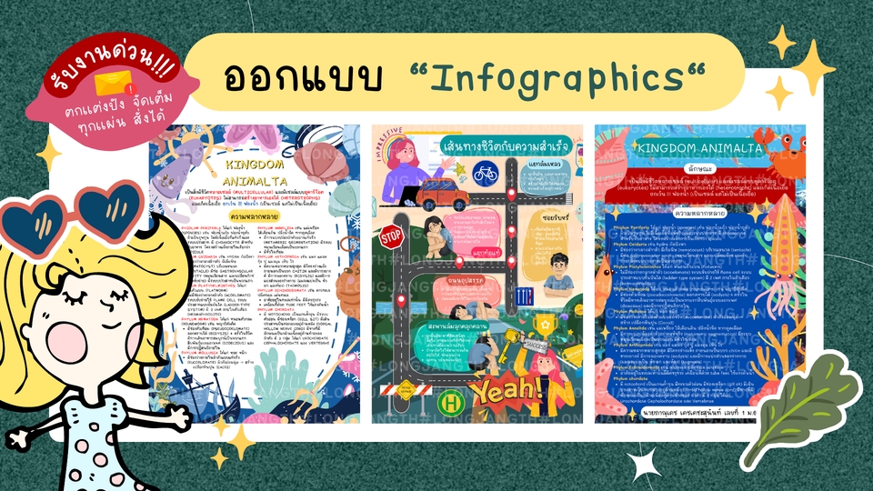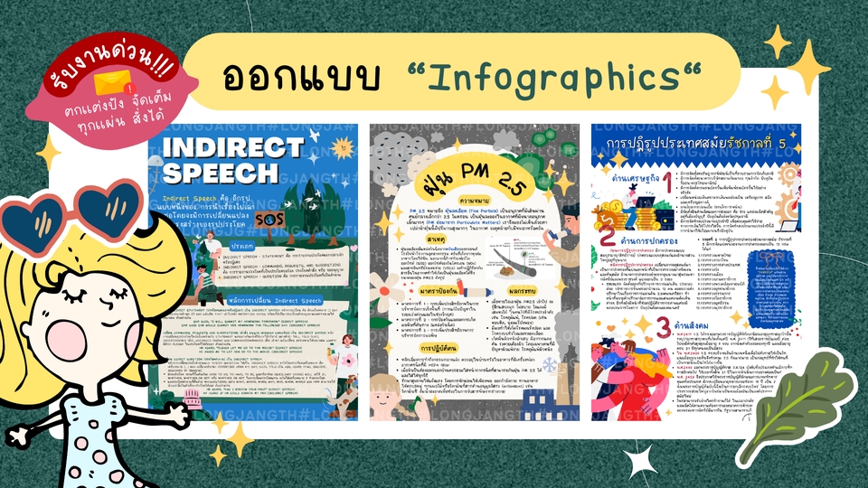 การออกแบบของเราจะเป็นแนวน่ารักๆ เหมาะกับลูกค้าที่ต้องการ Infographics แนวน่ารัก สดใส ตกแต่งด้วยตัวการ์ตูน ต้องการ Infographics น่ารักๆ ทักมาจ้างงานกับเราได้ทุกเวลา 🪄รับออกแบบ Infographics น่ารักๆ ทุกประเภท แนวทางการเราก็รับน้า 🪄แก้งานได้ 1-2 ครั้ง มีปัญหากับงานทักมาหาเราได้ตลอด 24 ชม. 🪄ไฟล์ที่ได้รับ ลิงค์ Canva/ .DDE/ .JPG/ .PNG/ .SVG (ลูกค้าแจ้งไฟล์ที่ต้องการได้) ขั้นตอนการทำงาน 1. แจ้งรายละเอียดงาน ประเภทของงาน รูปแบบหรือสไตล์งานที่ลูกค้าต้องการ (สามารถแคปจากตัวอย่างงาน หรือนำ ref ส่งมาให้เราเป็นแนวได้ค่ะ) แจ้งจำนวนหน้า ขนาด ไฟล์งานที่ ต้องการ และความเร่งด่วนของงาน 2. ส่งข้อมูล รูปภาพ หรือบลีฟเนื้อหาที่ต้องมีใน Infographics 3. แจ้งรายละเอียดเพิ่มเติม ประเมินราคา และวันเวลาในการรับงาน 4. เริ่มทำงาน และแก้ไขงานตามที่ลูกค้ากำหนด 5. ส่งไฟล์งานให้ลูกค้าตามที่ต้องการ
