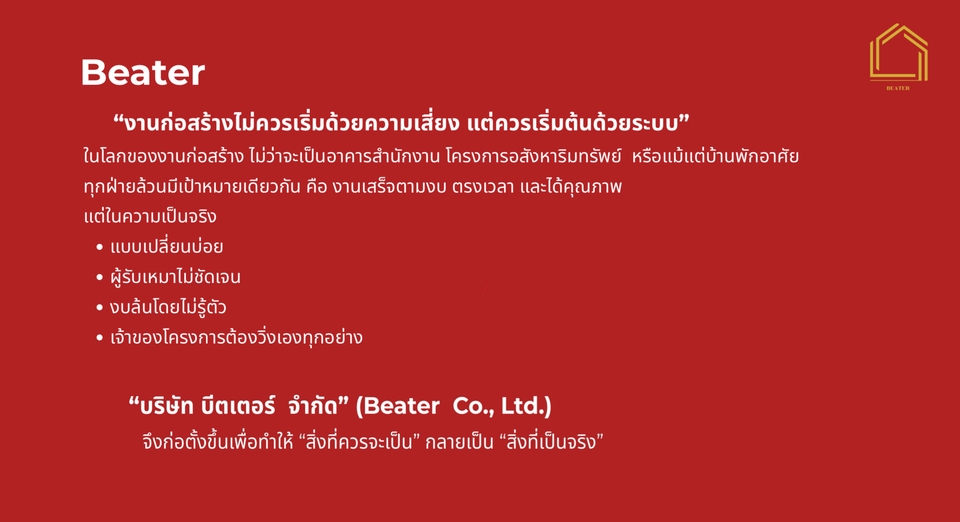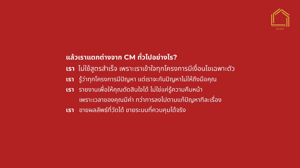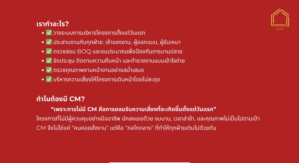 • ตรวจรับงานส่งเบิกทุกงวด + ทำรายงานตรวจรับอย่างละเอียดก่อนให้เจ้าของบ้านเบิกจ่ายเงิน