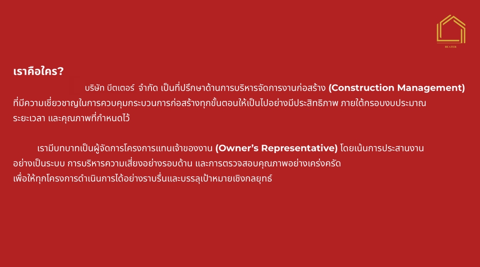 เป็นบริษัทที่ปรึกษาเเละบริหารงานก่อสร้างตามหลักวิศวกรรม โดยเฉพาะงานบ้านพักอาศัย งานอาคารเเละอื่นๆ ที่ต้องการความเชี่ยวชาญเฉพาะด้าน เน้นการสื่อสารให้ลูกค้าเข้าใจง่าย การดูแลหน้างานอย่างใกล้ชิด และติดตามงานที่มีระบบ