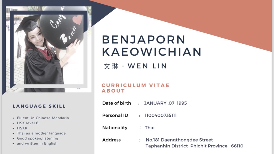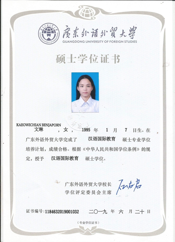 จบปริญญาตรี ภาษาเพื่อธุรกิจ เมืองกวางโจว ประเทศจีน จบปริญญาโท การเรียนการสอนภาษาจีน เมืองกวางโจว ประเทศจีน รับแปลภาษาจีน-ไทย / ไทย-จีน รับบริการล่ามจีน-ไทย , ไทย-จีน online รับเขียน-แปลบทความ จีน-ไทย / ไทย-จีน ขั้นตอนการทำงาน 1. รับงานต้นแบบ 2. ประเมินราคา 3. แจ้งระยะเวลา 4. ส่งงาน พร้อมตรวจสอบแก้ไข 5. ส่งงานสำเร็จเรียบร้อย