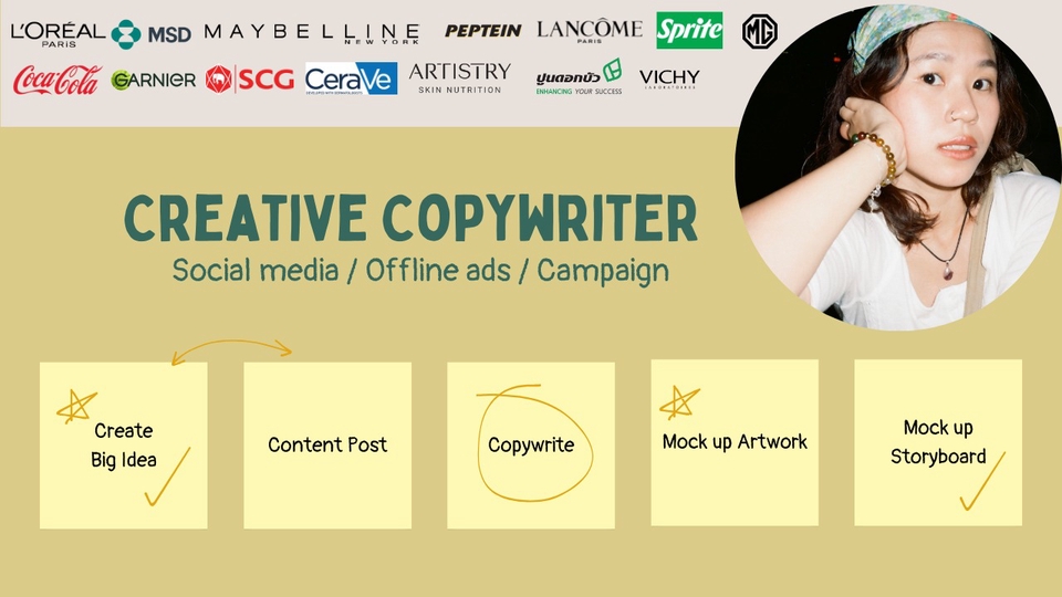 ประสบการณ์ Creative Copywriter บริษัท Agency ย่างเข้าปีที่ 5 . 💡 ครีเอทไอเดียโดนใจ Copy ฮุกตา 💡 Content เป๊ะ ตั้งแต่เริ่มแตกไอเดีย, Copy On AW, Caption รวมถึง Mock up ภาพให้กราฟิกทำงานง่ายขึ้น 💡 งาน Campaign ไม่กลัว! ขอแค่โยนโจทย์มา พร้อมลุยต่อจนครบลูป 💡 VDO แพลตฟอร์มไหนก็ไม่หวั่น จัดเต็มตั้งแต่ Script พร้อมวาง Mock up Storyboard ขั้นตอนการทำงาน 1. รับบรีฟจากลูกค้า 2. ต่อยอดไอเดียจากบรีฟ คุยรายละเอียดให้ตรงกัน 3. ส่งชิ้นงาน 1st Draft 4. แก้ไขได้ 1 ครั้ง พร้อม Revised ชิ้นงาน 5. ลูกค้า Approved