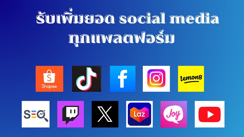 👉บริการของเรามีดังนี้ ✅Tiktok : เพิ่มยอดวิววิดีโอติ๊กตอก, เพิ่มคนติดตาม เพิ่มคนกดถูกใจ, เพิ่มคอมเมนต์ เพิ่มยอดแชร์, เพิ่มยอดเซฟวิดีโอ สตอรี่ ✅Shopee : เพิ่มยอดวิวไลฟ์สดช็อปปี้, เพิ่มคอมเมนต์ในไลฟ์สดช็อปปี้ ✅Facebook : เพิ่มผู้ติดตามเพจและเฟสส่วนตัว, กดไลค์ อิโมจิ คอมเม้นท์โพสต์, เพิ่มยอดวิว คลิปวิดีโอ Reels, เพิ่มคนดูไลฟ์สด เพิ่มเวลารับชม, เพิ่มสมาชิกเข้ากลุ่ม ✅Instagram : เพิ่มยอดผู้ติดตาม ยอดวิว ถูกใจ คอมเม้นท์ ✅YouTube : เพิ่มผู้ติดตาม ยอดวิว เพิ่มเวลาในการรับชม เพิ่มคนดูไลฟ์สด comment กดไลค์ ✅X-Twitter : รับดัน cashtag/hashtag trends ขึ้นเทรนยอดนิยม ✅Joylada : เพิ่มยอดไลค์ยอดติดตาม ✅Lemon8 : เพิ่มยอดไลค์ ยอดติดตาม ยอดsave ✅Twitch : เพิ่มผู้ติดตาม เพิ่มคนดูสตรีม ✅Lazada : เพิ่มผู้ติดตาม เพิ่มยอดไลค์ ✅SEO : ทำ seo traffic สำหรับคนอยากดันอันดับ keyword เว็บตัวเอง, เพิ่มยอดคลิกคีย์เวิร์ด ช่วยดันอันดับเว็บไซต์, เพิ่มยอดการเข้าชมเว็บไซต์ **👍 รับประกันคุณภาพผลงาน👍 **