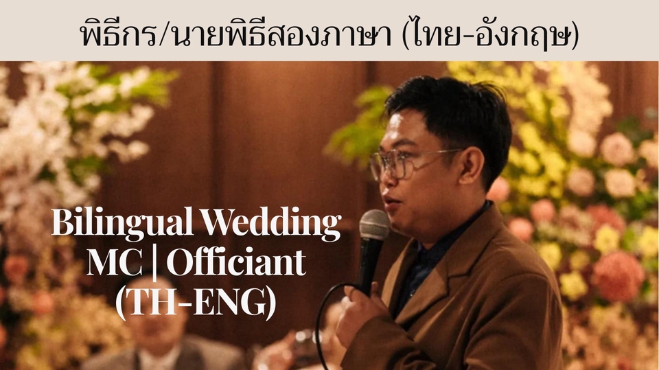 ฿9,900- พิธีกรและนายพิธีสองภาษา (ไทย-อังกฤษ) - ไม่เร่งรีบ อยู่ได้ตลอดงาน สามารถอยู่เอนเตอร์เทนแขกได้หลังเสร็จพิธี - ลูกค้าทั้งสองฝ่ายจะได้รับการสื่อสารที่เข้าใจตรงกัน เป็นมืออาชีพ