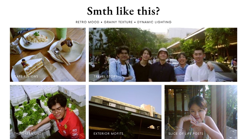 ฿1,500เหมาะสำหรับถ่าย สตรีทสไตล์ ฯลฯ - ใช้กล้องดิจิตอลยุค 2000s พิกเซลต่ำ มี grain ดิบ ๆ ชัดเจน - เหมาะถ่ายกลางวัน/กลางแจ้ง เพื่อใช้แสงธรรมชาติให้ภาพโดดเด่น - mood & tone อารมณ์เรโทร ย้อนยุคไม่ซ้ำใคร