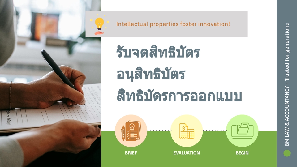 ฿10,000บริการจดสิทธิบัตร/อนุสิทธิบัตร/สิทธิบัตรการออกแบบ รวมถึง - ร่างเอกสารรายละเอียดการประดิษฐ์ - ร่างข้อถือสิทธิ และบทสรุป - เตรียมเอกสารประกอบที่เกี่ยวข้องกับการยื่นจดสิทธิบัตร/อนุสิทธิบัตร/สิทธิบัตรการออกแบบ - ยื่นจดสิทธิบัตร/อนุสิทธิบัตร/สิทธิบัตรการออกแบบ จนกระทั่งได้รับเลขคำขอจดสิทธิบัตร/อนุสิทธิบัตร/สิทธิบัตรการออกแบบ (งานจะไม่รวมถึงภาพเขียน ค่าธรรมเนียมของกรมทรัพย์สินทางปัญญา และขั้นตอนภายหลังจากนี้ เช่น การประกาศโฆษณา การขอแก้ไข การขอเปลี่ยนแปลง ประเภทสิทธิ หรือการตรวจสอบการประดิษฐ์)