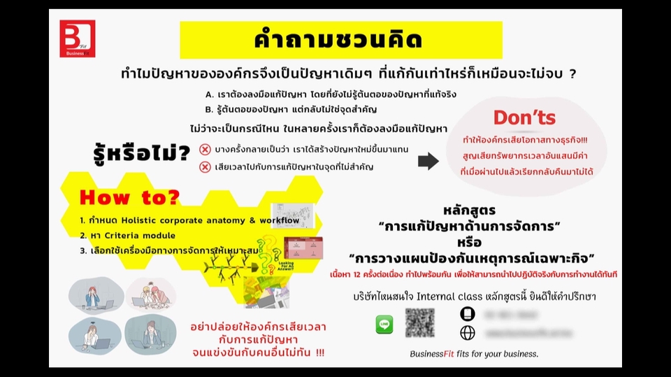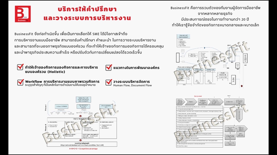 BusinessFit คือทีมงานที่เป็นผู้บริหารทั้งธุรกิจขนาดกลางและขนาดใหญ่ ครอบคลุมทั้งกลยุทธ์และการลงมือปฏิบัติจริง ทั้งการวางระบบและรื้อระบบบริหารงาน ประสบการณ์กว่า 20 ปี จากประสบการณ์ทำให้เรารู้ข้อจำกัดของกิจการขนาดกลางและขนาดเล็ก และสามารถวางระบบบริหารได้จริงควบคู่ไปกับการโค้ชสอนปฏิบัติควบคู่กันไป