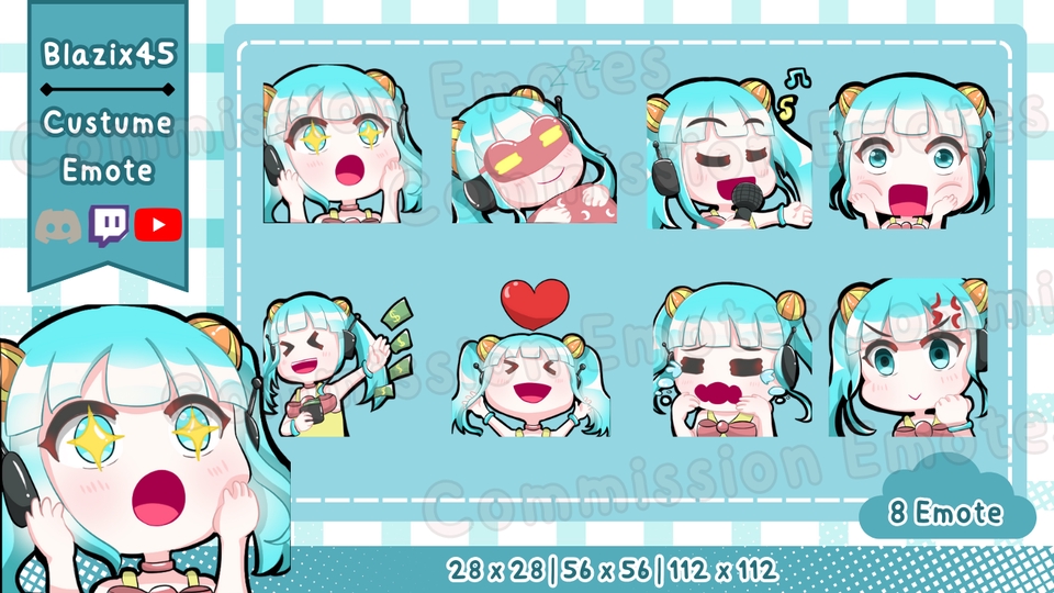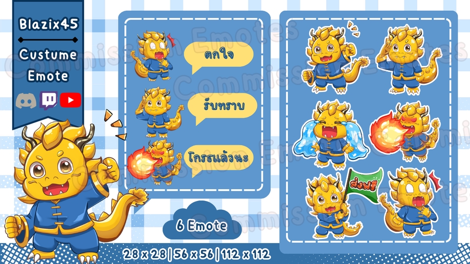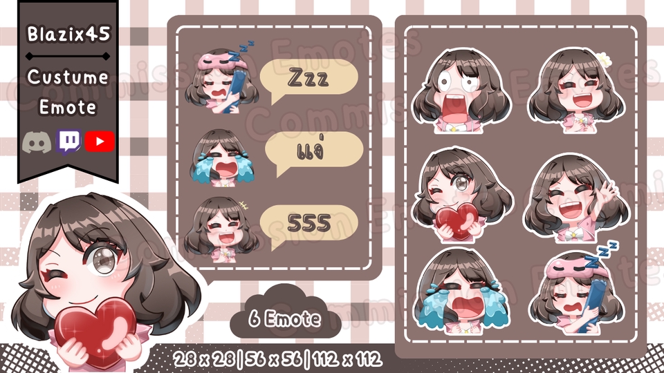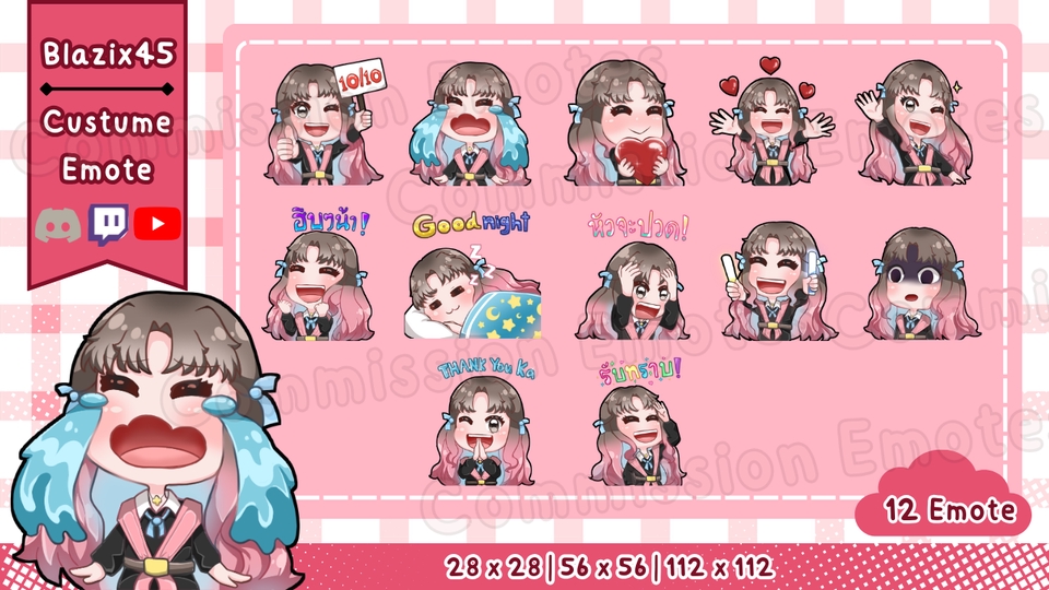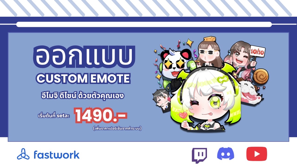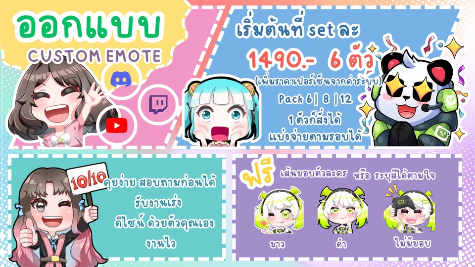 รับวาดตัวละครchibi Emote twitch & Discord สำหรับการใช้งานอิโมจิในแพลตฟอร์ม twitch & Discord สามารถสอบถามเพิ่มเติมได้ครับ ขั้นตอนในการทำงาน 1.ลูกค้าสามารถกรอกรายละเอียด(สเก็ต รายละเอียดต่างๆ) จะมีตารางให้ทางคุณลูกค้าสเก็ต 2.ส่งสเก็ตครั้งแรกให้ลูกค้าเช็คความถูกต้อง 3.ลงสี(base color)ให้ลูกค้าตรวจเช็ค 4.ลงสีภาพทั้งหมดลูกค้าสามารถแก้ได้ไม่เกิน 2 ครั้ง 5.ส่งไฟล์ให้คุณลูกค้าผ่านgoogle drive file JPG/PNG/PSD 300dpi ขั้นตอนการทำงาน 1. ลูกค้าสามารถกรอกรายละเอียด(สเก็ต รายละเอียดต่างๆ) 2. ส่งสเก็ตครั้งแรกให้ลูกค้าเช็คความถูกต้อง 3. ลงสี(base color)ให้ลูกค้าตรวจเช็ค 4. ลงสีภาพทั้งหมดลูกค้าสามารถแก้ได้ไม่เกินที่กำหนด 5. ส่งไฟล์ให้คุณลูกค้าผ่านgoogle drive file JPG/PNG/PSD 300dpi