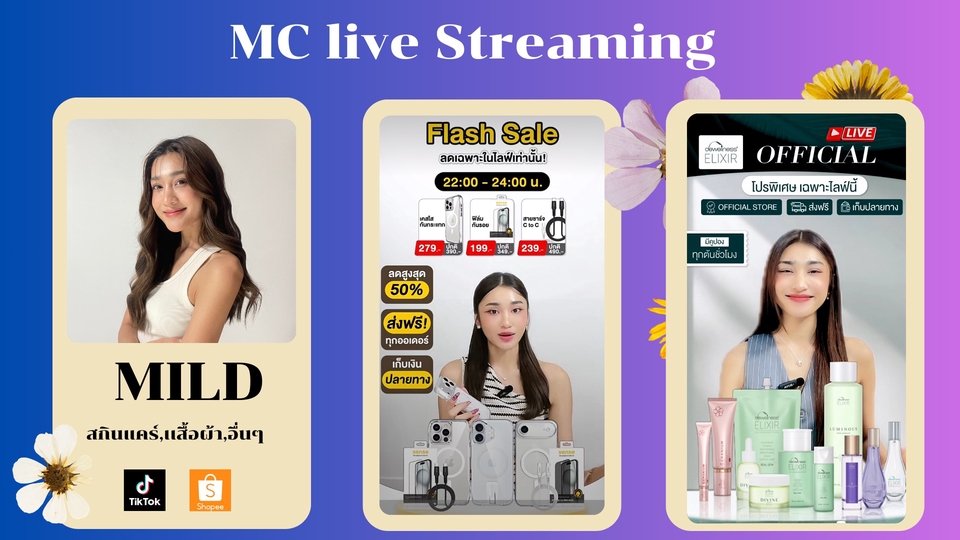 MILD – MC Live Streaming มีประสบการณ์ไลฟ์ขายสินค้า เช่น สกินแคร์ แฟชั่น เสื้อผ้า คอนแทคเลนส์ และแกดเจ็ต บนแพลตฟอร์ม TikTok และ Shopee ช่วยดันยอดขายด้วยการนำเสนอสินค้าและโปรโมชันระหว่างไลฟ์อย่างมืออาชีพ *มีความรับผิดชอบ ตรงต่อเวลา*