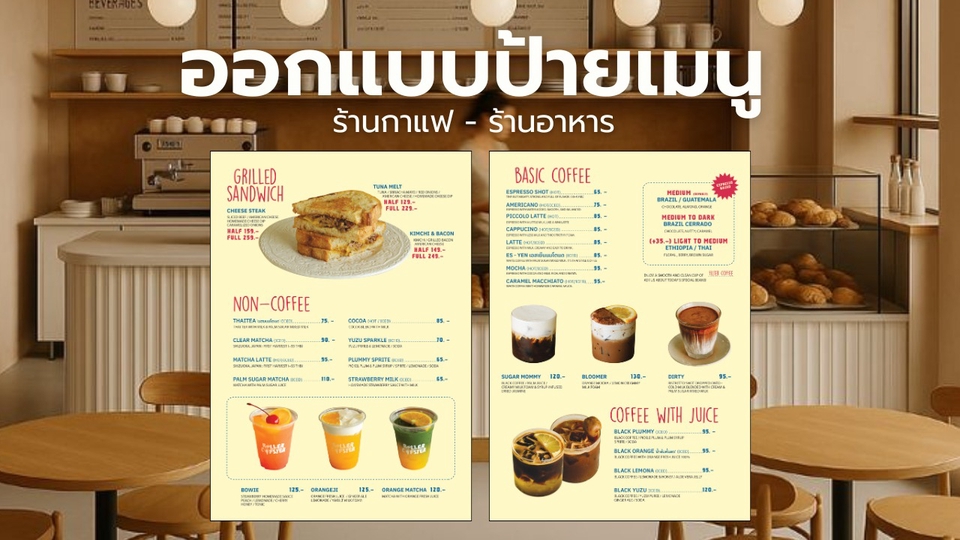 ออกแบบป้ายเมนูสำหรับคาเฟ่/ร้านกาแฟ/ร้านอาหาร ขนาด A4 จำนวน 1-2 แผ่น ระยะเวลาการทำงาน 3 วัน แก้งานได้ 3 ครั้ง - กรณีมากกว่า 3 ครั้งขออนุญาตเก็บค่าบริการแก้งานจุดละ 100 บาท - กรณีแก้ไขข้อความผิด แก้ฟรีค่ะ ขั้นตอนการทำงาน 1.คุยรายละเอียด รูปแบบร้าน และ Ref. ที่ต้องการ โทนสี เพื่อหาแนวทางที่ชอบร่วมกัน 2. ทางผู้ว่าจ้างส่ง Logo , รูปภาพเมนู , รายละเอียดที่ต้องการใส่ทั้งหมดให้ฟรีแลนซ์ 3. ฟรีแลนซ์เริ่มทำผลงานเวลา 3 วัน ส่งอัพเดทผลงาน 4. ตรวจเช็คงาน และแก้ไขผลงานได้ 3 ครั้ง 5. ส่งตรวจดราฟสุดท้าย เมื่อทางผู้ว่าจ้างพอใจทางเราจะส่งเป็นไฟล์สำหรับส่งพิมพ์ให้ทันทีค่ะ 🙏😊