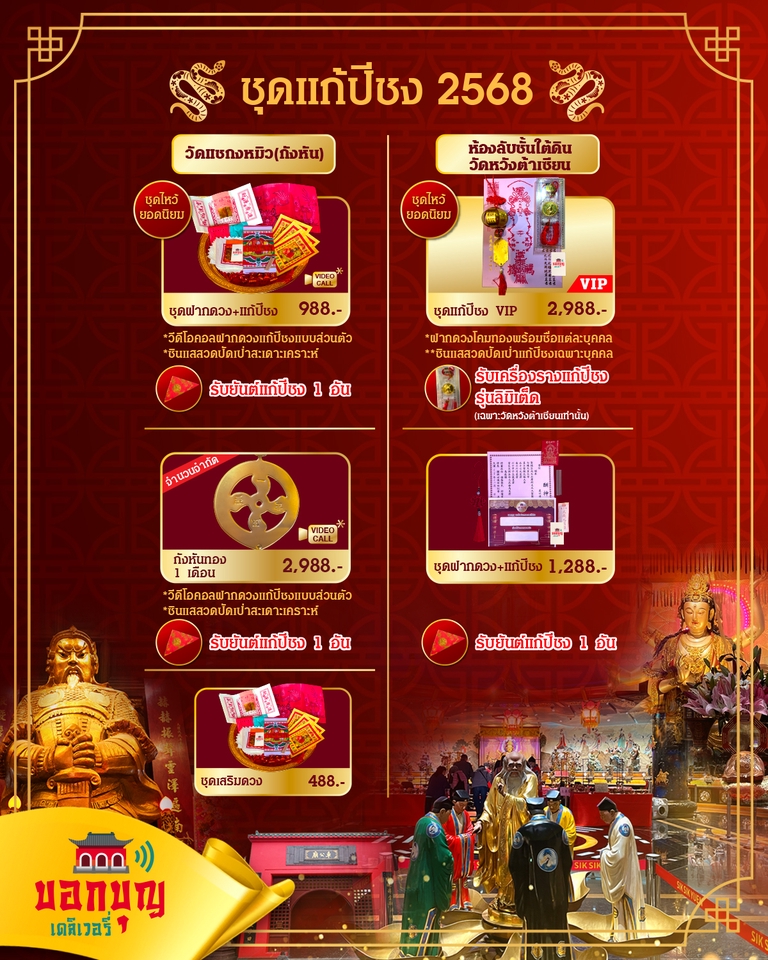 ช่วงนี้ดวงตก งานเงินติดขัด! แก้ปีชง วัดแชกงหมิว วัดกังหัน อันดับ1ฮ่องกง ต้นตำรับความเชื่อโหราศาสตร์จีน ไท้ส่วยเอี๊ยะครบ 60 องค์ ใครเกิดปีชง และ ปีที่ได้รับผลกระทบ ปีกุน ปีมะเส็ง ปีขาล และ ปีวอก แนะนำให้เสริมเป็นพิเศษ ส่วนท่านใดที่ไม่ชง ก็สามารถไหว้เทพเจ้าประจำปีเกิด เพื่อให้ท่านปกป้องคุ้มครองเราตลอดปี ขั้นตอนการทำงาน 1. แจ้งวันเดือนปีเกิด(ค.ศ.+ปีนักษัตร) พร้อมชื่อ-นามสกุล และเวลาเกิด🟢(หากไม่ทราบไม่เป็นไรทางเราจะระบุว่า “เวลาดี” ลงไป) หรือแจ้งปี พศ. หรือ คศ. (ให้ทางเราช่วยเทียบกับตารางได้หากไม่ทราบปีนักษัตร) 🐹🐮🐯🐰🐲🐍🐴🐐🐵🐔🐶🐷 2. หลังชำระเงิน ภายใน 10 วัน จะดำเนินการเข้าพิธีแก้ชงให้