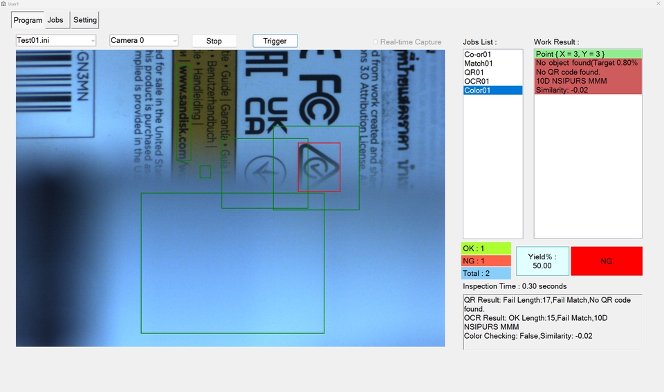 Application สำหรับตรวจสอบชิ้นงานหรือการอ่าน QR code แบบอัตโนมัติ ใช้งานง่ายสามารถใช้ได้กับกล้อง Web Cam USB camera หรือ GigE มีการส่งออกผลลัพธ์แบบ contact signal(ซื้อI/O boardเพิ่ม) รวมทั้งบันทึกรูปภาพและไฟล์ข้อมูล ขั้นตอนการทำงาน 1. ขอรูปงานที่ต้องการตรวจสอบกับทางลูกค้า หัวข้อที่ต้องการให้ทดสอบ 2. ทดลองและoptimize program และแจ้งผลกลับ 3. ส่งมอบอุปกรณ์(I/O Box) และติดตั้งsoftwareให้กับPCของลูกค้า 4. ทำการทดสอบจริงจนได้ผลลัพธ์ที่ลูกค้าพอใจ(Online support 3months)