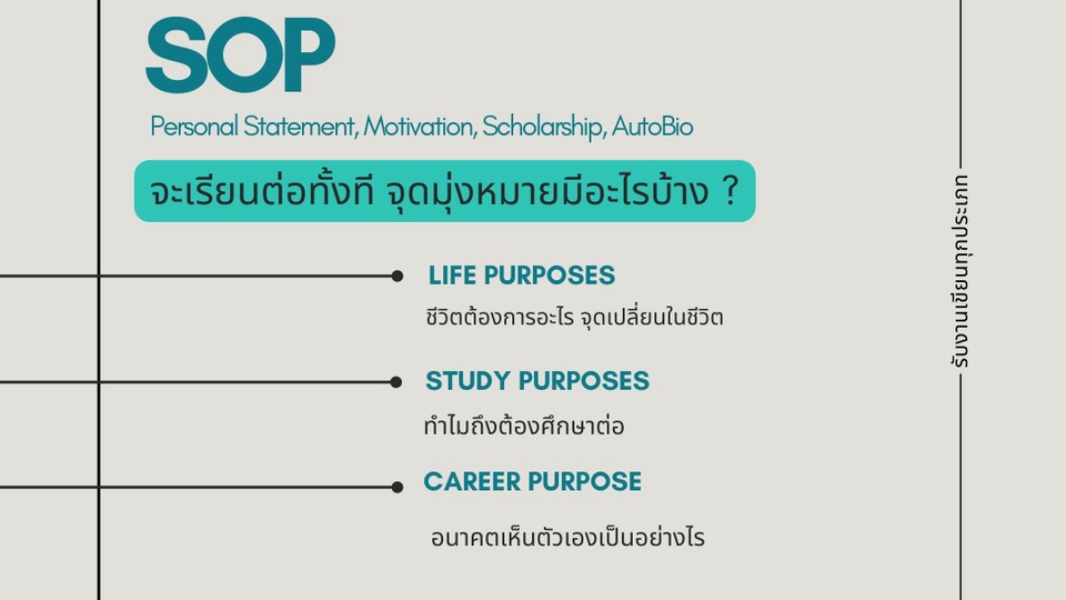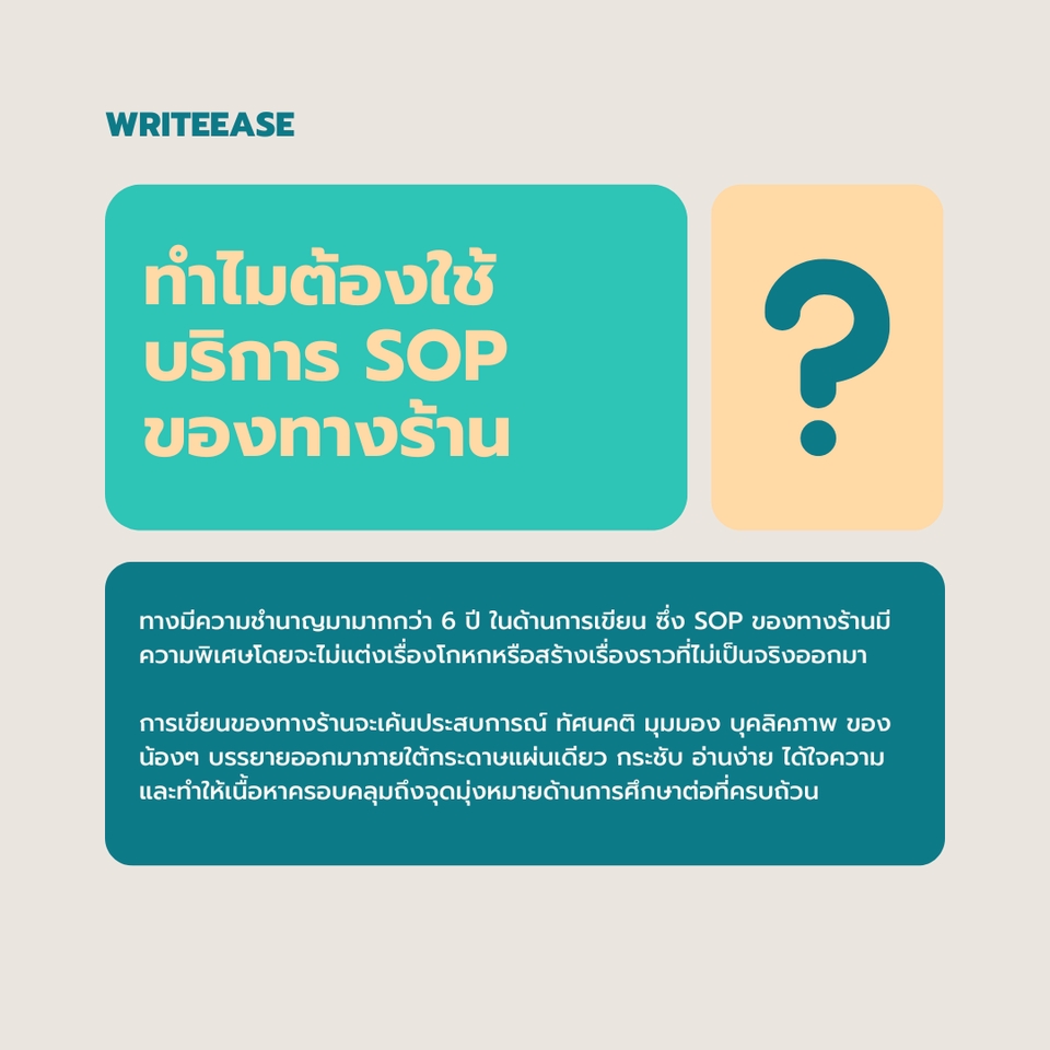 มีประสบการณืการทำงานด้านนี้มาหลายปี เริ่มจากการสอนพิเศษภาษาอังกฤษ เห็นความสำคัญของการศึกษาและเรียนต่อของเด็กๆ ภายใต้ชื่อร้าน WriteEase รับเขียนเอกสารดังต่อไปนี้ 1. Statement of Purpose (SOP), Personal Statement 2. Study plan , Research proposal 3. Letter of motivation, scholarship Letter, Recommendation Letter 4. Cover Letter 5. Autobio 6. CV, Resume 7. แปลเอกสารอื่นๆ 8. Proof reading ทางร้านจะเขียนเรื่องราวจากความเป็นจริงและประสบการณ์ของน้องๆ ทั้งหมด ไม่มีการบิดเบือน เพียงแต่ช่วยเรียบเรียงเรื่องราวให้เหมาะสมและเหมาะกับความต้องการของมหาลัย เขียนจากประสบการณ์จริง กระชับ อ่านง่าย ภายใน 1 หน้ากระดาษ A4 ขั้นตอนการทำงาน 1. แจ้งแพคเกจที่ต้องการผ่านทางแชท 2. ทางร้านสอบถามข้อมูลเบื้องต้น โดนมีบรีฟให้กรอก 3. ร้านดำเนินการทำงานตามบรีฟ 4. รองาน 1-2 วัน แก้ฟรี 1 ครั้ง