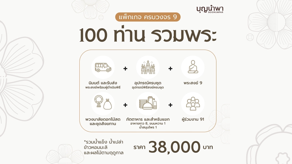 ฿38,000บุญนำพา รับจัดงานบุญ รายละเอียดดังนี้ พิธีสงฆ์พระ 9 รูป อุปกรณ์พิธีสงฆ์ครบชุดพร้อมมัคนายกดูแลพิธี และ ภัตตาหารถวายพระ พร้อมอาหารเลี้ยงแขก **เฉพาะกทมและปริมณฑล (ต่างจังหวัดสามารถสอบถามก่อนได้ครับ)