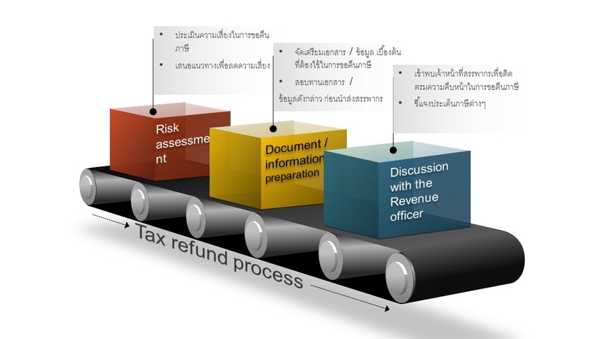 ดำเนินการขอคืนภาษีจากสรรพากรตั้งแต่ตั้นจนจบ โดยมีการประเมินความเสี่ยง รวมถึงสรุปรายการเอกสารที่จำเป็นต้องใช้ในการขอคืนภาษี เป็นตัวกลางในการเข้าพบเจ้าหน้าที่สรรพากร รายละเอียดราคาเพิ่มเติม ค่าที่ปรึกษา ขึ้นอยู่กับ ความเสี่ยงและประเด็นในการขอคืนภาษีของลูกค้า และค่าที่ปรึกษาดังกล่าว ยังไม่รวมค่าเดินทาง และค่าที่พัก (หากมี) ขั้นตอนการทำงาน 1. ประเมินความเสี่ยง ผลกระทบที่อาจเกิดขึ้น รวมถึงแนวทางการลดความเสี่ยง ในการขอคืนภาษีร่วมกับลูกค้า 2. จัดเตรียมรายการเอกสารที่ต้องใช้ในการขอคืนภาษีในเบื้องต้น เพื่อส่งให้ลูกค้าดำเนินการ รวมถึงให้คำปรึกษาในการจัดเตรียมเอกสารนั้นๆ 3. สอบทานเอกสารที่จัดเตรียมโดยลูกค้า 4. เข้าพบเจ้าหน้าที่สรรพากรที่ดูแลการขอคืนภาษีของลูกค้า เพื่อรวบรวมประเด็น / ข้อมูลเพิ่มเติม 5. ประสานงานระหว่างเจ้าหน้าที่สรรพากร /ลูกค้า จนจบกระบวนการขอคืนภาษี 6. สรุปผลการขอคืนภาษี ความเสี่ยง ผลกระทบ และแนวทางแก้ไขในอนาคต