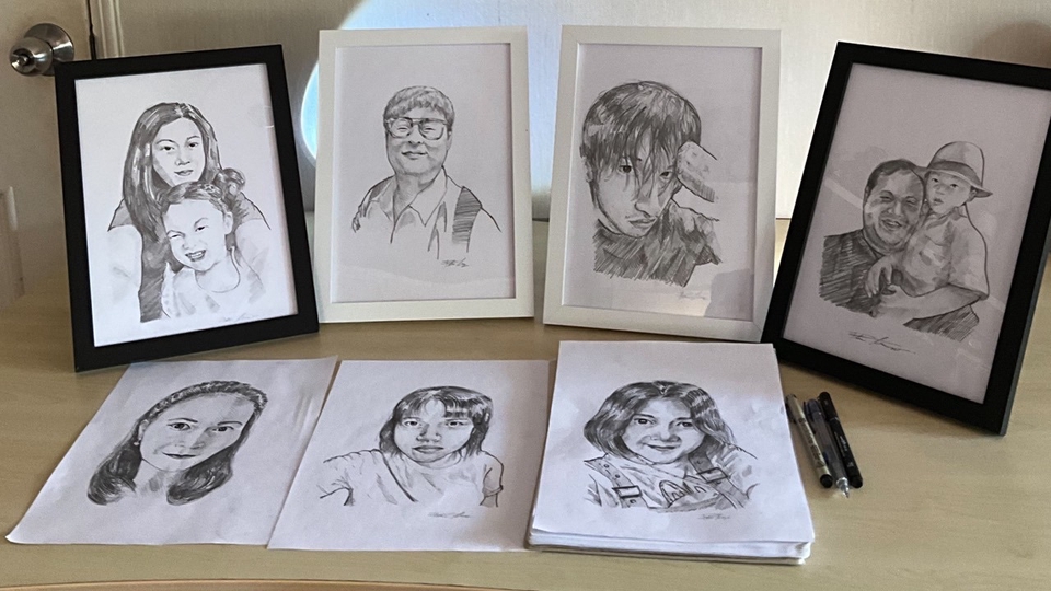 รับวาดภาพเหมือนจากภาพถ่าย ขนาด A4 พร้อมกรอบภาพ ใช้เทคนิคดินสอ 2B และปากกาดำ Pigma วาดด้วยมือทุกขั้นตอน เหมาะสำหรับเป็นของขวัญ ของแต่งบ้าน หรือของที่ระลึก ขั้นตอนการทำงาน 1. ลูกค้าส่งภาพถ่ายต้นฉบับ ที่ต้องการให้วาด พร้อมระบุจำนวนคนในภาพ และความต้องการเพิ่มเติม (เช่น อยากให้ใส่ข้อความ หรือวาดลงกรอบ) 2. เริ่มวาดภาพ ด้วยเทคนิคดินสอ/ปากกาดำ 100% เวลาขึ้นอยู่กับความซับซ้อนของภาพ 3. ส่งตัวอย่างงาน (ภาพถ่าย) ให้ลูกค้าตรวจสอบและขอแก้ไขได้ 1 ครั้ง (เล็กน้อย เช่น เส้นหรือเงา) 4. จัดส่งภาพ
