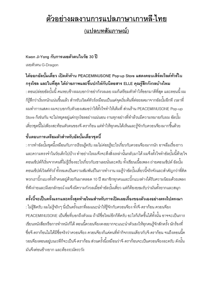 รับแปลภาษาเกาหลี งานคุณภาพโดยบัณฑิตคณะอักษรศาสตร์ ภาษาเกาหลี ประสบการณ์รวมกว่า 10 ปี ไม่ว่าจะแปลจาก ภาษาเกาหลี เป็น ภาษาไทย หรือแปลจากภาษาไทย เป็น ภาษาเกาหลี ก็ไม่มีปัญหา รับประกันความถูกต้อง แม่นยำ 100% ถูกต้องตามหลักไวยากรณ์ทั้งภาษาไทย และภาษาเกาหลี ด้วยทักษะการแปล เขียน และเรียบเรียง - แปลหน้า Website / หน้าเว็บเพจ / หน้ารายการ หรือ เมนู - ฉลากสินค้า / Labels - บทสัมภาษณ์ / นิยาย / ซีรีส์ / บทความประเภทต่าง ๆ - จดหมาย / อีเมล / ข้อความอื่น ๆ ทั่วไป หรือหากมีงานแปลใดที่อยากให้บริการ สามารถทักมาพูดคุยสอบถามก่อนได้ค่ะ ยินดีตอบและให้คำปรึกษาทุกท่าน ทุกข้อความ ♡ **ไม่รับแปลเอกสารราชการ เอกสารทางกฎหมาย และเอกสารข้อมูลทางการแพทย์ ขั้นตอนการทำงาน 1. พูดคุยเพื่อทำความเข้าใจการทำงานให้ตรงกัน และบรีฟรายละเอียดงาน 2. เสนอราคา และลูกค้าชำระเงินตามใบเสนอราคา 3. เริ่มทำงาน ระยะเวลาทำงานตามที่ตกลง 4. ตรวจสอบชิ้นงาน และแก้ไข 5. ส่งไฟล์งานฉบับสมบูรณ์