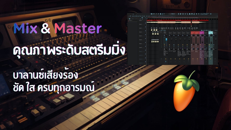 ฿1,500งาน Mix & Master คือการดูแลทุกขั้นตอนของเสียงเพลงให้ครบจบในที่เดียว ตั้งแต่ปรับบาลานซ์เสียงร้อง ดนตรีให้เข้ากันอย่างกลมกล่อม ไปจนถึงเก็บรายละเอียดสุดท้ายให้เสียงออกมาคมชัด หนา มีพลัง