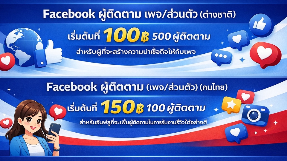 เพิ่มผู้ติดตามเพจ โปรไฟล์ส่วนตัว Facebook ไทย/ต่างชาติ 100% ราคาถูก การันตีคุณภาพ!