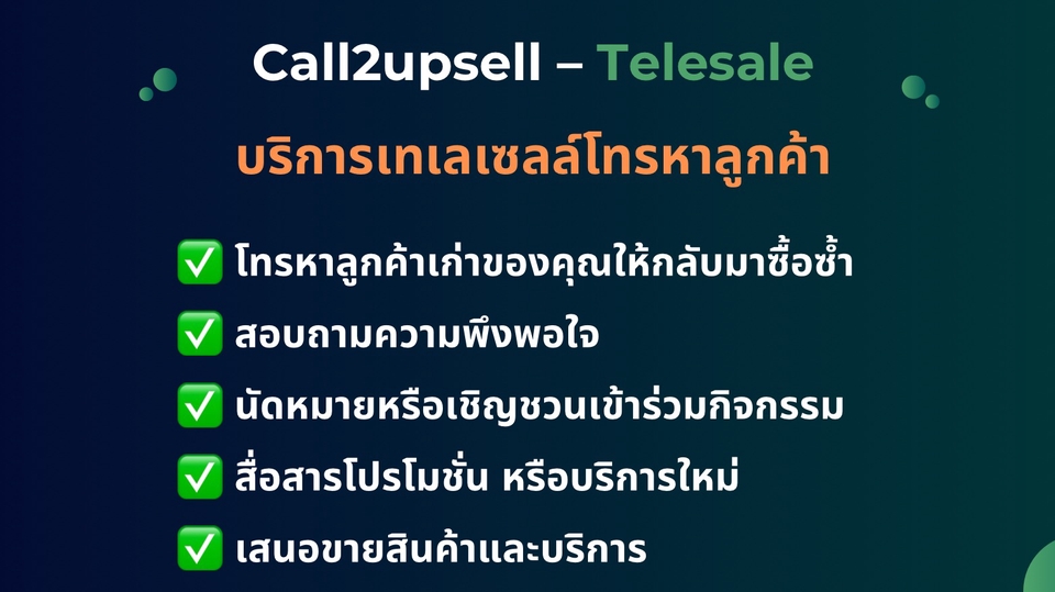 Call2upsell – บริการเทเลเซลล์สำหรับธุรกิจที่ต้องการรักษาลูกค้าเก่าและเพิ่มยอดขายอย่างยั่งยืน หาลูกค้าใหม่ต้นทุนสูงกว่า รักษาลูกค้าเก่า! บริการของเราช่วยคุณโทรหาลูกค้าเดิมเพื่อกระตุ้นยอดขายอย่างมีประสิทธิภาพ 📞 โทรติดตามลูกค้าเก่าให้กลับมาซื้อซ้ำ 📞 สอบถามความพึงพอใจ 📞 นัดหมายเพื่อพรีเซ็นต์ 📞 แจ้งโปรโมชั่นหรือบริการใหม่ เหมาะสำหรับ: • คลินิก / โรงพยาบาล • โรงแรม / รีสอร์ต • ร้านค้าออนไลน์ • โรงเรียน / สถาบันสอน • แบรนด์สินค้าทุกประเภท