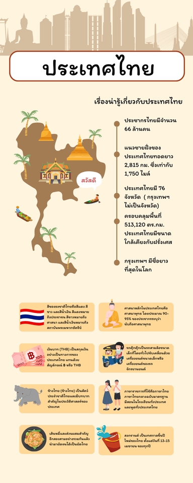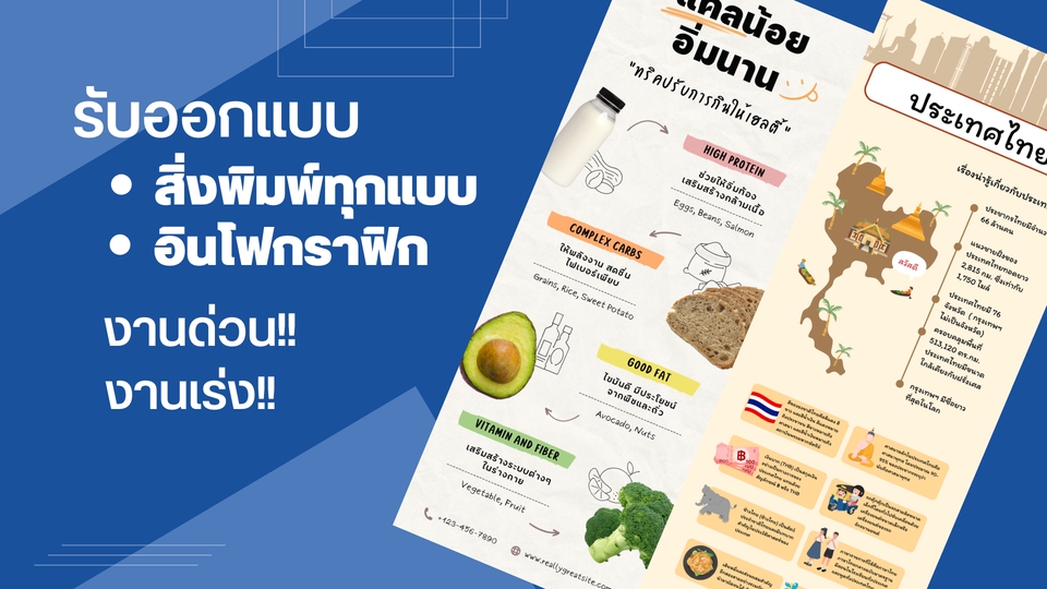 ตัวอย่างของงานอินโฟกราฟิก เรื่องน่ารู้เกี่ยวกับประเทศไทยภายใน1แผ่น ตั้งแต่จำนวนประชากร แนวชายฝั่งของประเทศไทย มีจังหวัดทั้งหมดเท่าไหร่ เมืองหลวง คลอบคลุมพื้นที่กี่ตารางกิโลเมตร และข้อมูลเชิงสถิติต่างๆ ขั้นตอนการทำงาน 1. สั่งงาน บรีฟงานตามที่ต้องการ 2. ยื่นแบบให้เลือกขั้นที่1 โดยมีให้เลือก3แบบ 3. ลูกค้าสั่งแก้ได้ตามแพคเกจที่เลือก 4. ส่งงานและสิ้นสุดงาน