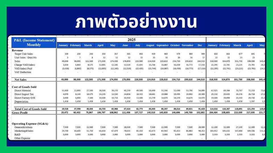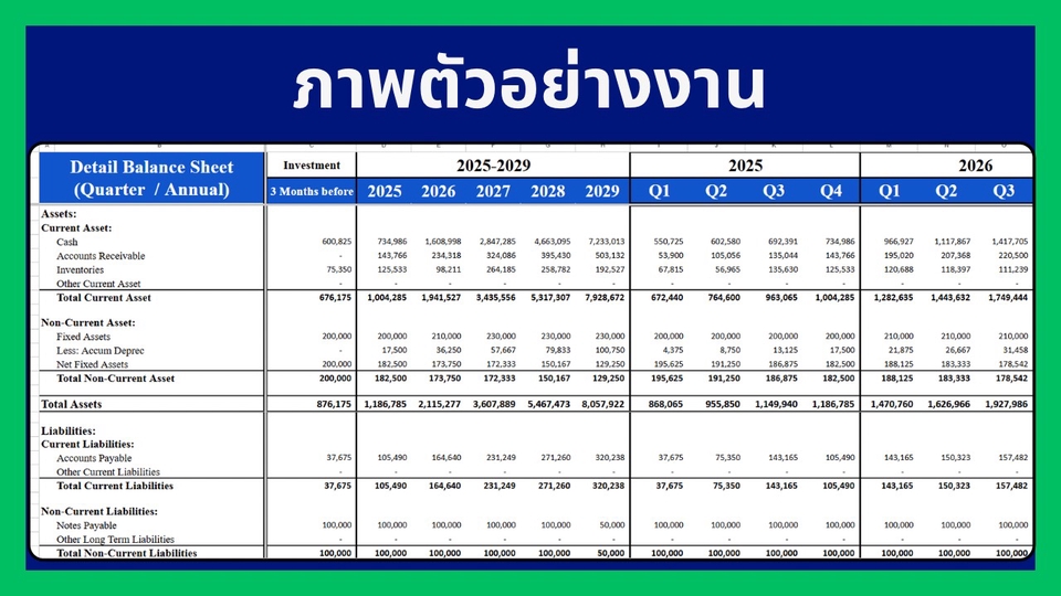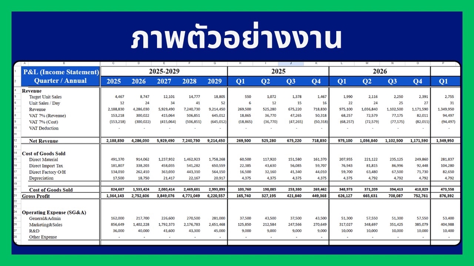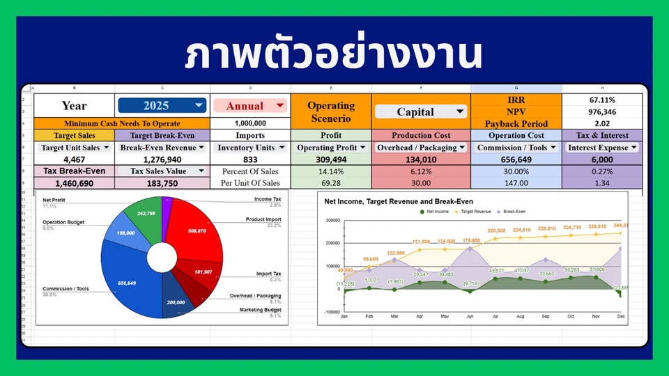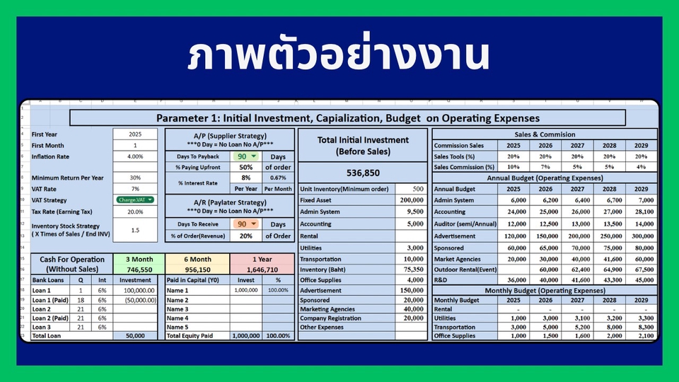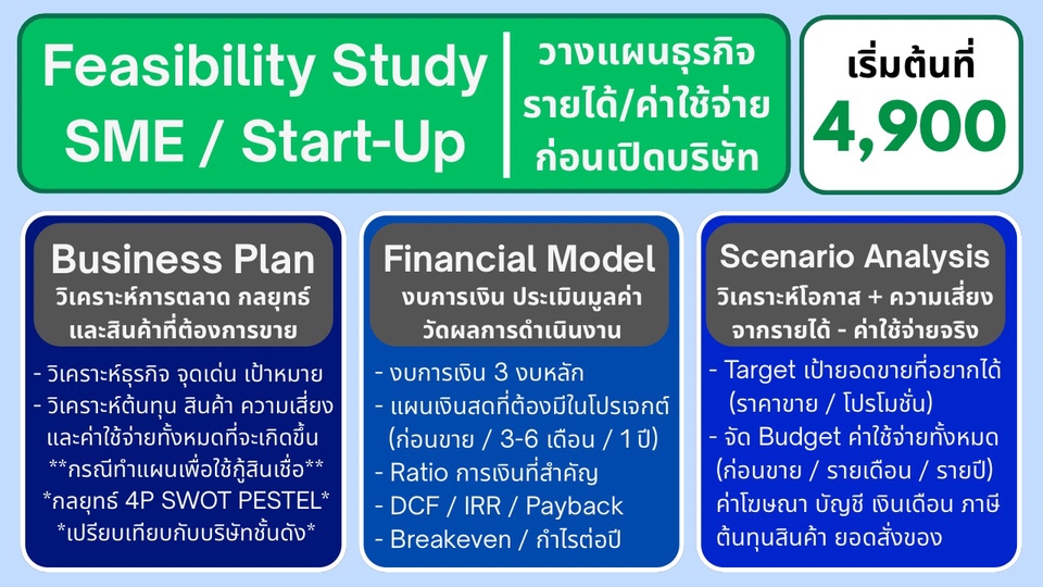 วา่งแผนธุรกิจก่อนเปิดบริษัท Startup โดยเปรียบเทียบค่าใช่จ่ายที่เกิดขึ้นจริง Package 1.) วางแผนการเงินธุรกิจ 4,900 บาท (5 วัน) - ปรึกษาตัวสินค้าเบื้องต้น จุดแข็ง จุดอ่อนเปรียบเทียบกับความเป็นไปได้ในทางธุรกิจ(ไม่มีเอกสาร) - งบลงทุนก่อนขาย (Initial Cost) ค่าเดินทาง ค่าก่อสร้าง จดทะเบียนธุรกิจ อุปกรณ์จำเป็น ดีไซน์สินค้า ดีไซน์ร้าน โฆษณา ค่าวัตถุดิบเตรียมก่อนขาย ค่าเสียโอกาส(ถ้ามี) - ต้นทุนขายของวัตถุดิบ จำแนกสินค้า รวมทั้งสินค้านำเข้า + Economic of Scales - Budget ค่าใช้จ่ายการขายและบริหาร (SG&A) ตั้งแต่ เงินเดือน ค่าเช่า ค่าคอมมิชชั่น โฆษณา ระบบแอดมิน ระบบบัญชี+Auditor - ปรึกษาธุรกิจลูกค้าที่ต้องการเพื่อเปรียบเทียบค่าใช้จ่ายและประเมินเป้าหมายรายได้ที่แท้จริง ลูกค้าจะได้รับที่ได้วิเคราะห์ต่อไปนี้ 1.) Financial Model + Financial Projection 5 ปี ที่แม่นยำ ประกอบด้วย Income Statement, Balance Sheet, Cashflow Statement [ทั้งรายเดือน(เฉพาะ Income Statement) ราย Quarter รายปี] 2.) จุดคุ้มทุน ยอดและ % ผลตอบแทนของธุรกิจ (IRR / NPV) ปีที่คืนทุน Payback Period พร้อม Financial Ratio ทั้งหมด 3.) Dashboard โชว์ยอด หรือ Ratio ที่ต้องการ เพื่อให้ลูกค้าดูง่าย และเข้าใจ 4.) Model ปรับ สมมุติฐานได้เอง 4 อย่าง พร้อมการสอนใช้งาน - ยอดเป้าหมายการขายที่ต้องการ / ยอดเติบโตในการขาย - ค่าใช้จ่ายก่อนเปิดบริษัท, Budget ค่าใช้จ่ายรายเดือน/รายปี, กลยุทธ์ VAT, Inventory, ลูกหนี้-เจ้าหนี้การค้า - ตั้งราคาการขาย, ค่าคอมมิชชั่น, ต้นทุนสินค้าทางตรง-อ้อม, ต้นทุน Import สินค้า, Economics of Scale - อสังหา / เครื่องจักร / สิทธิบัตร ที่ลงทุน พร้อมค่าเสื่อมราคากำหนดได้เอง - Budget เงินเดือนผู้ประกอบการ ลูกน้องในกิจการทุกแผนก Package 2.) จัดแผนธุรกิจ กลยุทธ์ และเอกสารเพื่อนำเอกสารไปขอกู้ 10,900 บาท สิ่งที่ลูกค้าจะได้ - Package 1.) - แผนธุรกิจ วิเคราะห์ตัวสินค้า และคู่แข่งภายในสินค้านั้น, SWOT Analysis, 4P, PESTEL Analysis - ปรึกษาโครงสร้างพนักงาน ตามยอดขายที่คาดว่าจะเป็น - จัดแผนการโฆษณาออนไลน์ เปรียบเทียบคู่แข่ง และเปรียบเทียบค่าใช้จ่าย - จัดกลยุทธ์สินค้าคงเหลือ ต้นทุนสินค้าที่ขาย ช่องทางการขาย - กลยุทธ์เป้าหมายการแข่งขัน ยอดขายต่อเดือน/ปี - จัดความเป็นไปได้ของยอดขายในปีแรก และปี 2-5 - เอกสารที่จำเป็นในการขอแผนสินเชื่อจากธนาคาร - เปรียบเทียบแผน จากยอดขาย+ค่าใช้จ่ายจริง ขั้นตอนการทำงาน - คุยรายละเอียดความต้องการของลูกค้า - คุยรายละเอียดสินค้าที่จะขาย คู่แข่งการค้า - ตกลงขอบเขตการทำงาน / เสนอราคา การคิดราคาขึ้นอยู่กับ 1. ความยากง่ายของงาน 2. ความต้องการของลูกค้า 3. ความเร่งรีบของงาน - เริ่มงานตามขอบเขตที่ตกลงกัน สื่อสารตามวันเวลา และจัดส่งงานตามไทม์ไลน์ที่แจ้งไว้ - รับประกันคุณภาพงานและความพึงพอใจของลูกค้า - 