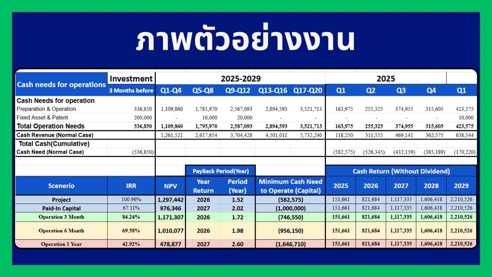 ฿4,900ปรึกษาสินค้าและธุรกิจเบื้องต้น 1.) Financial Model+Financial Projection 5 ปี 2.) จุดคุ้มทุน ยอดและ % ผลตอบแทนของธุรกิจ 3.) Dashboard โชว์ยอด / Ratio 4.) Model ปรับสมมุติฐานได้เองพร้อมการสอนใช้งาน