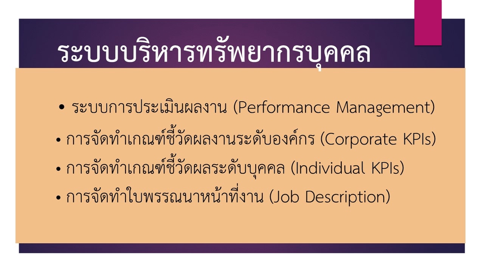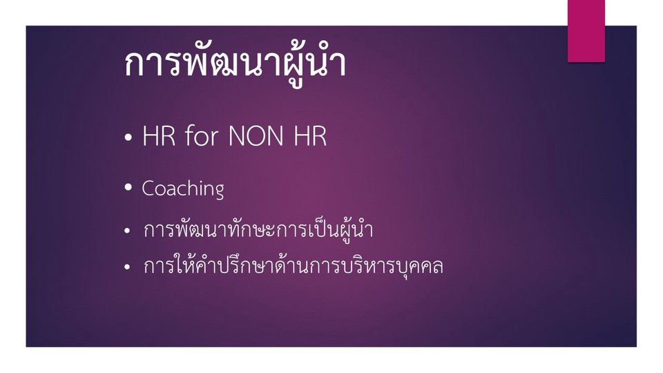 -ทำไมต้องวางระบบบริหารงานบุคคล? เพราะคนคือผู้สำคัญที่จะทำให้ธุรกิจประสบความสำเร็จหรือไม่ การวางแผนงานบุคคลเพื่อให้มีระบบที่จะสร้างให้คนมุ่งเน้นผลการทำงาน พัฒนาคนเพื่อให้พัฒนางาน จึงมีความสำคัญค่ะ จากประสบการณ์ในงานบริหารบุคคลในองค์กรต่อเนื่องกว่า 25 ปี ทำให้มั่นใจว่าจะช่วยวางระบบบริหารบุคคลให้ธุรกิจต่างๆ รวมถึง start up ได้ค่ะ และสิ่งสำคัญอีกอย่างคือการสื่อสารและการทำงานร่วมกันระหว่างเรา จะทำให้ลูกค้าได้รับสิ่งที่ต้องการค่ะ - ธุรกิจขนาดใหญ่เท่าใดจึงจะวางระบบบุคคลและจ้างได้?? เรารับงานทุกอย่างค่ะ ไม่ว่าจะเป็นธุรกิจที่พึ่งเริ่ม หรือธุรกิจที่ก่อตั้งมานานแล้วและอยากพัฒนาระบบ เพื่อพัฒนาคนให้เติบโตไปกับธุรกิจของท่านค่ะ หรือธุรกิจที่ประสบปัญหาการบริหารบุคคลและอยากมีแนวทางแก้ไขปัญหา - ข้อมูลในการอ้างอิงต่างๆ เช่น กฎหมายแรงงาน การสำรวจค่าจ้างและเงินเดือน สวัสดิการ ดัชนีเงินเฟ้อ เพื่อนำมาอ้างอิงใช้ในการทำงานค่ะ รายละเอียดราคาเพิ่มเติม 1. หากให้นำเสนองานด้วยตนเอง ขอคิดค่าใช้จ่ายการเดินทางตามจริงและ Man Day เพิ่มเติม (2,000 บาท ไม่เกิน 3 ชม) 2. ลูกค้าแก้ไขงานได้ 2 ครั้ง 3. ยินดีให้คำแนะนำทางไลย์หรือทางโทรศัพท์หลังการส่งมอบงาน 4. รับเป็นที่ปรึกษาด้านทรัพยากรบุคคล (Freelance 4,000 บาทต่อเดือน) ขั้นตอนการทำงาน 1. คุยรายละเอียดขอบเขตงานที่ลูกค้าต้องการ วิเคราะห์ความจำเป็นสภาพปัจจุบัน ระบบที่มี และนำเสนอขอบเขตงานที่เหมาะสมให้ลูกค้า 2. ยืนยันขอบเขตงาน เสนอราคา ส่งร่างงานให้พิจารณาทาง Email 3. ส่งงานตามกำหนด ลูกค้าตรวจรับงาน