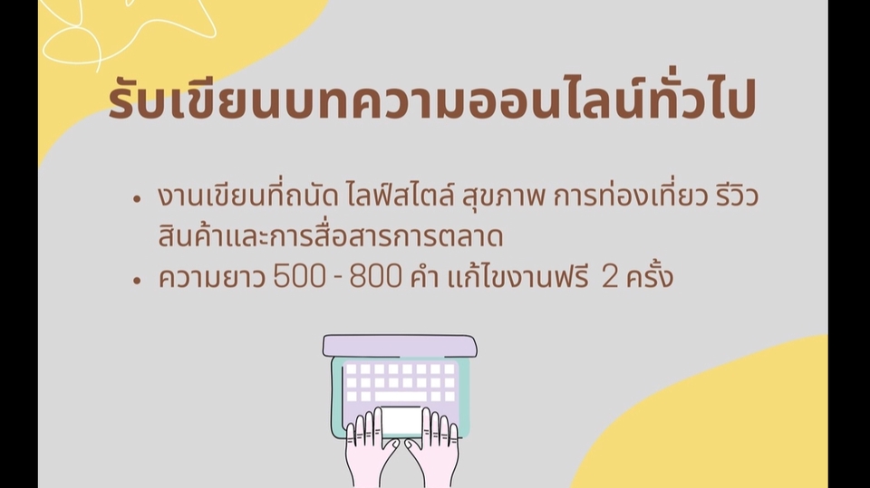 - รับเขียนบทความประเภทไลฟ์สไตล์ ท่องเที่ยว สุขภาพ การสื่อสารทางการตลาด รีวิวและโปรโมตสินค้า - รับเขียนคอนเทนต์ทั่วไป - รับเขียนเรซูเม่/จดหมายสมัครงานภาษาอังกฤษ - รับพิมพ์งาน ภาษาไทย ภาษาอังกฤษ