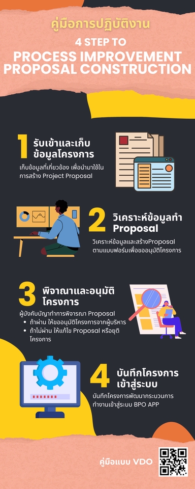 ออกแบบ Infographic ให้สวยถูกใจคุณ และสามารถสื่อสารสาระสำคัญของข้อมูลที่ต้องการจะสื่อผ่าน Infographic ได้อย่างชัดเจน ด้วยประสบการณ์ในการทำงานด้วนการพัฒนากระบวนการ ดังนั้นจึงจำเป็นจะต้องจัดทำคู่มือหรือสื่อที่ใช้ในการสื่อสารเพื่อให้เป็นมาตรฐาน โดยการใช้ Infographic เข้ามาช่วยให้ดึงดูดผู้อ่านและให้ผู้อ่านเข้าใจถึงสาระสำคัญได้อย่างชัดเจน ขั้นตอนการทำงาน 1. รับรายละเอียดงานจากลูกค้า 2. กำหนด Mood & Tone สำหรับงานลูกค้า 3. เริ่มทำ Infographic ให้ลูกค้าเลือก 2 แบบ 4. ส่งงานให้ลูกค้าพิจารณา พร้อมแก้ไข 5. ส่งมอบงาน Final ให้ลูกค้า