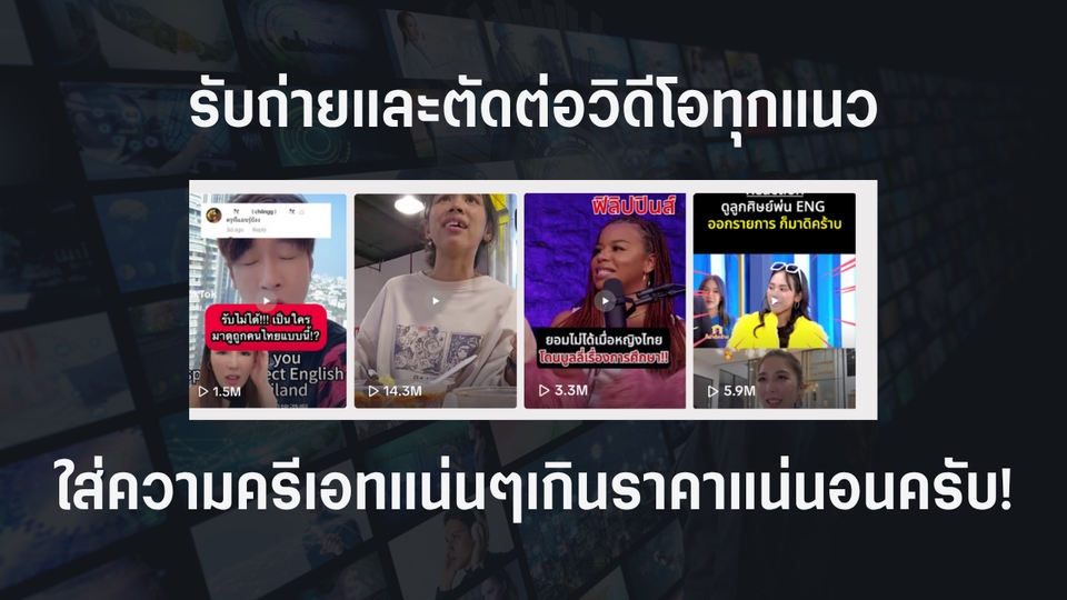 ฿1,000"ตัดต่อวิดีโอคลิปสั้น พร้อมซับ" ตัดต่อวิดีโอความยาวไม่เกิน 1 นาที ใส่ซับไตเติล ภาษาไทย หรือ อังกฤษ ปรับแสง สี เสียง พื้นฐาน ฟรี! แก้ไขงานได้ 2 ครั้ง ส่งงานภายใน 2-3 วัน เริ่มต้น 400-1000 บาท