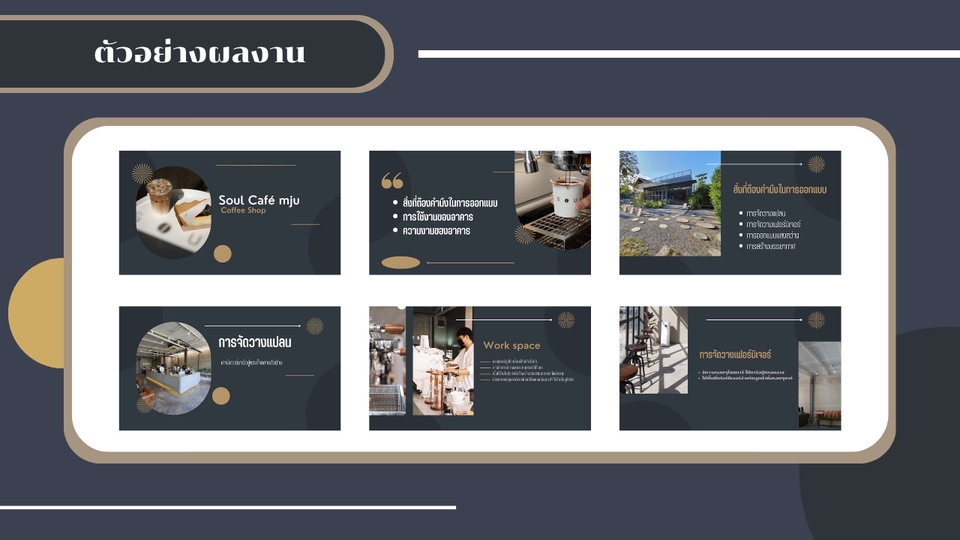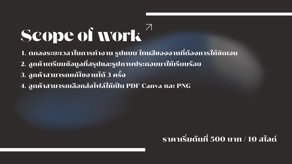 บริการออกแบบสไลด์งานด้วย Canva เรารับออกแบบและจัดทำสไลด์นำเสนอด้วย Canva ตามความต้องการของลูกค้า เหมาะสำหรับนักเรียน นักศึกษา หรือผู้ที่ต้องการงานนำเสนอที่ดูดี มีโครงสร้างชัดเจน 1. ราคาเริ่มต้นเพียง 500 บาท สำหรับเนื้อหา 10 สไลด์ 2. ระยะเวลาจัดทำ ภายใน 1–4 วัน 3. กรณีเร่งด่วน มีบริการด่วนพร้อมคิดค่าบริการเพิ่มเติม 100 บาท 4. สามารถขอแก้ไขงานได้สูงสุด 3 ครั้ง
