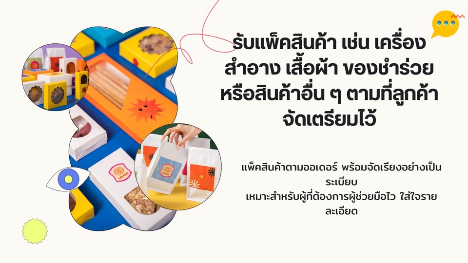 -รับแพ็คสินค้า เช่น เครื่องสำอาง เสื้อผ้า ของชำร่วย หรือสินค้าอื่น ๆ ตามที่ลูกค้าจัดเตรียมไว้ -แพ็คตามจำนวน / เซต / แบบฟอร์มที่กำหนด -จัดเรียงสินค้าใส่กล่อง/ซอง พร้อมปิดผนึกเรียบร้อย -เหมาะสำหรับผู้ที่ต้องการผู้ช่วยมือไว ใส่ใจรายละเอียด -มีประสบการณ์ในการแพ็คของชำร่วยงานแต่ง และของทำบุญ ขั้นตอนการทำงาน 1. รับคำสั่ง/รายการสินค้า (Order Receiving) พร้อมอุปกรณ์จากผู้จ้างงาน 2. จัดเตรียมสินค้า (Item Picking) 3. ตรวจสอบสินค้า (Quality Check) 4. เตรียมวัสดุในการแพ็ค (Packing Material Preparation) 5. แพ็คสินค้า (Packing) 6. ติดป้ายและเอกสาร (Labeling & Documentation) 7. ตรวจสอบรอบสุดท้าย (Final Check) 8. จัดส่งให้ฝ่ายจ้างงาน (Handover to Shipping)